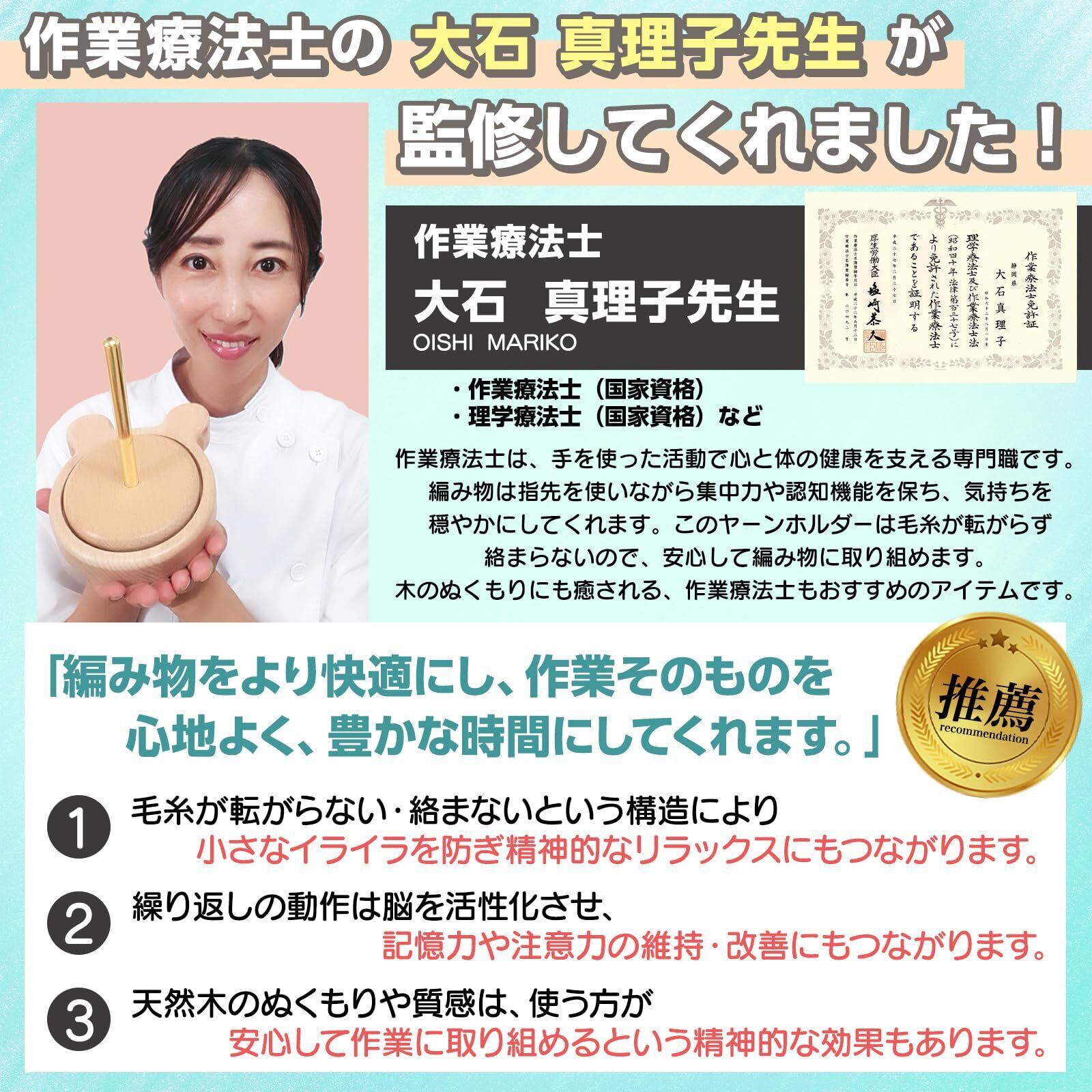 【癒される 愛らしいくまデザイン。】くまの形をした土台がポイント。他にはない愛らしいくまデザインに癒されます。使わない時はお部屋のインテリアとして、そっと飾っておくだけで雰囲気がアップ。趣味仲間へのプレゼントにも。「こんなの欲しかった!」と思ってもらえる、とっておき。 【商品名】くるくる糸巻(ヤーンホルダー) 【サイズ】直径約12cm 高さ約16cm 【重さ】約360g 【材質】本体:木製(天然木) 軸:金属 【ご購入前にご確認ください】本製品は、天然木を使い、一つひとつ丁寧に手作業で仕上げています。そのため、木目や質感に個体差があり、部分的にささくれやザラつきが感じられる場合がございます。風合いや素材感を大切にしているための仕様となりますが、気になる場合は、紙やすりなどで軽く整えてからご使用ください。
