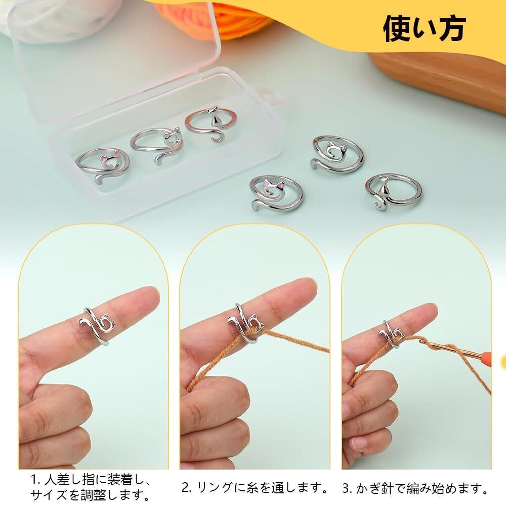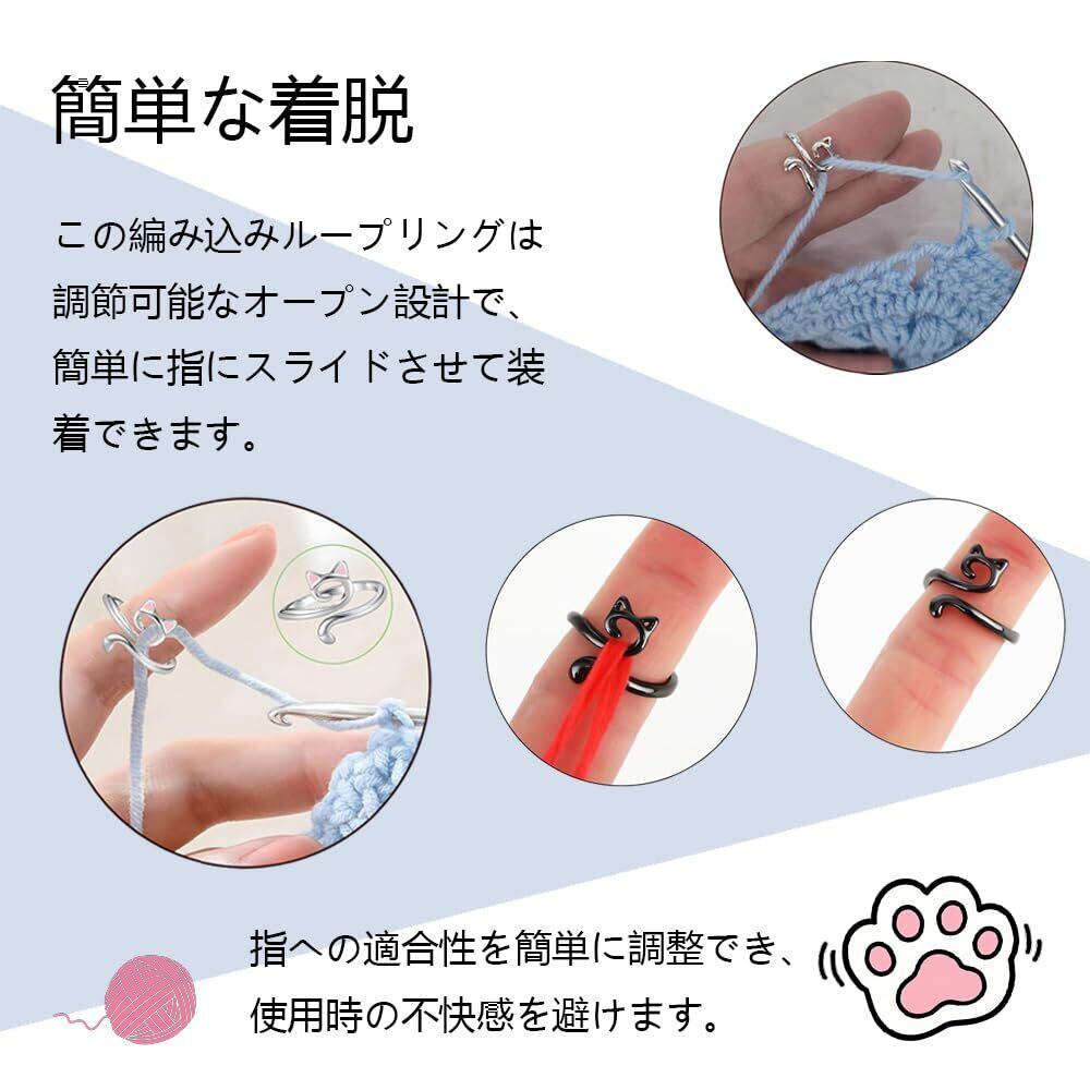 【パッケージ内容】4つの異なるスタイルの編み物ループかぎ針編みリングが含まれています。各日の使用や交換のニーズに応じて、これらの編み物ループは指の保護と作業速度の向上を助けます。 【簡単な着脱】この編み込みループリングは調節可能なオープン設計で、簡単に指にスライドさせて装着できます。指への適合性を簡単に調整でき、使用時の不快感を避けます。 【指を保護し】編み物の効率をアップ - 指への糸の摩耗を防ぎ、均一なテンションを維持することで、スムーズで効率的な編み物を実現。 手のを軽減し、長時間のかぎ針編みをより簡単で楽しいものにします。 【優れた実用性】この製品はかぎ針編みのための実用的なツールで、指を糸の摩耗から保護し、糸のテンションを一貫して保持し、効率的に編み物のスピードを向上させ、快適で滑らかな編み心地を提供します。 【かわいいデザイン】このかわいらしい猫型の 編み物 道具は、フック編み愛好家にとって理想的なアクセサリーです。調節可能なオープンデザインにより、好みのサイズにカスタマイズできます。家庭やオフィスの魅力的な装飾として使用するか、裁縫プロジェクトにかわいさを加えることができます。