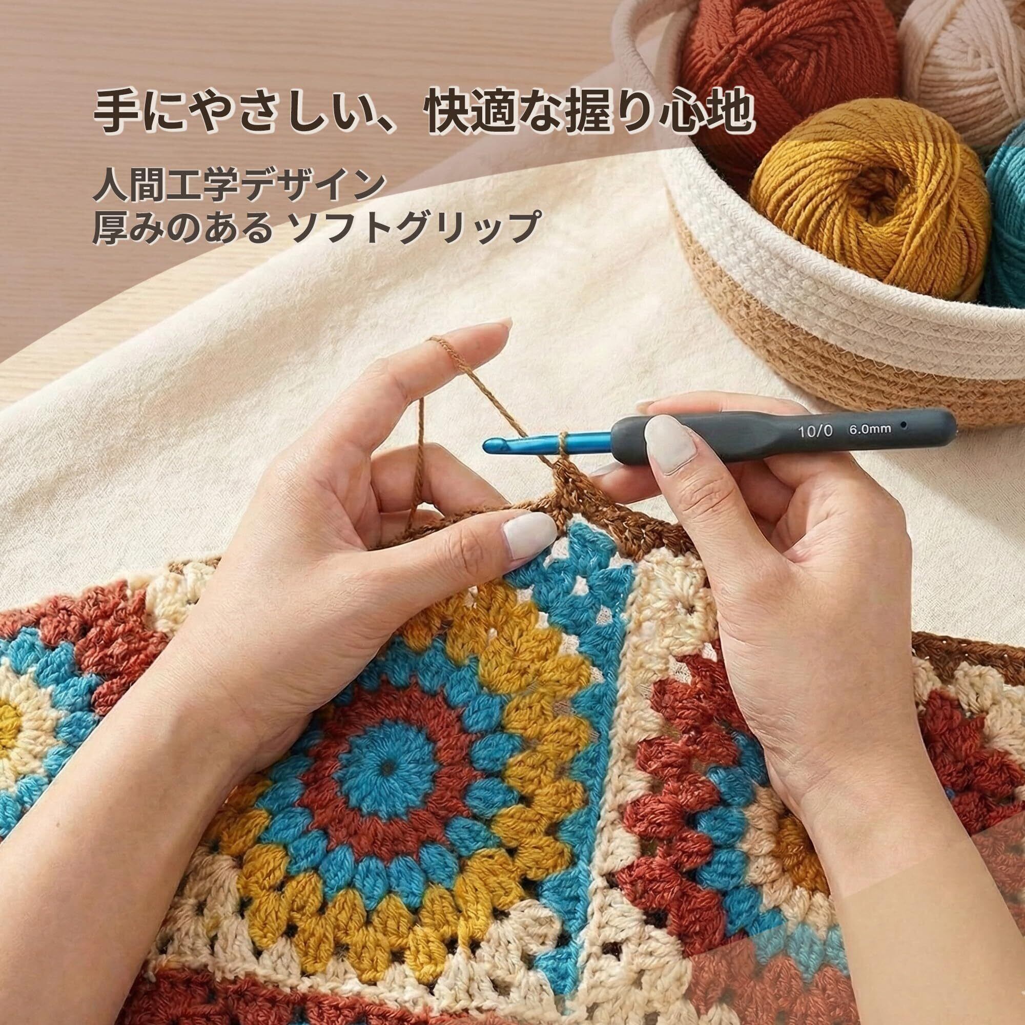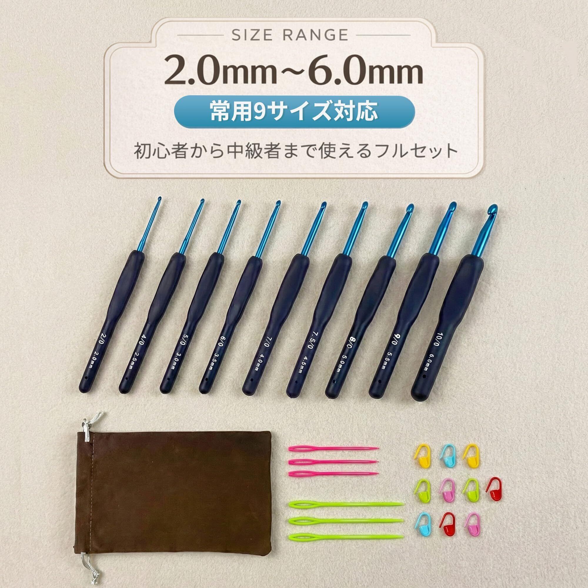 ① サイズ充実|2.0mm〜6.0mm かぎ針9本セット 2.0mm〜6.0mmまで、よく使われる基本サイズを揃えたかぎ針9本セット。細編みから中太糸まで対応でき、初心者にも使いやすい構成です。