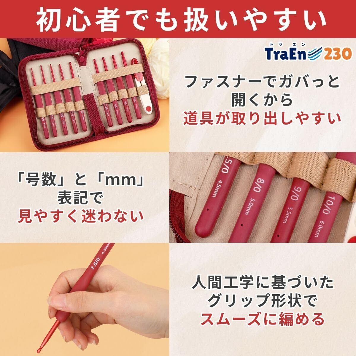 TraEn230 かぎあみ キット 初心者 かぎ針セット かぎ編み 編み物 かぎ針 かぎ針編み 編み針 6号 (レッド)