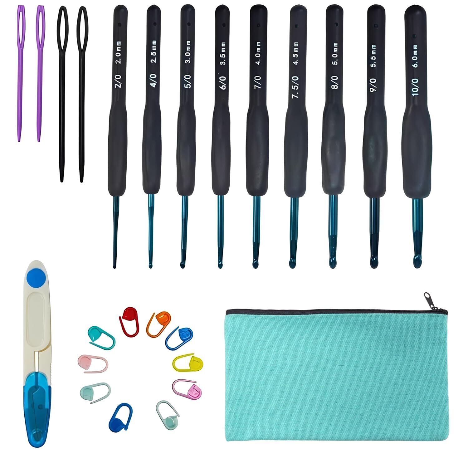 【基本セット内容】24 点のかぎ針セットには、かぎ針9 本、マーキングバックル 10 個(カラーランダム)、2 サイズの縫い針 4 本、ハサミ 1 本、ポータブル収納バッグ 1 個が含まれています。9 本のかぎ針サイズ:2.0mm、2.5mm、3.0mm、3.5mm、4.0mm、4.5mm、5.0mm、5.5mm、6.0mm。初心者からプロまで安心して使用でき、全ての工具がコンパクトに整理されており、すぐにかぎ編みを始められます。