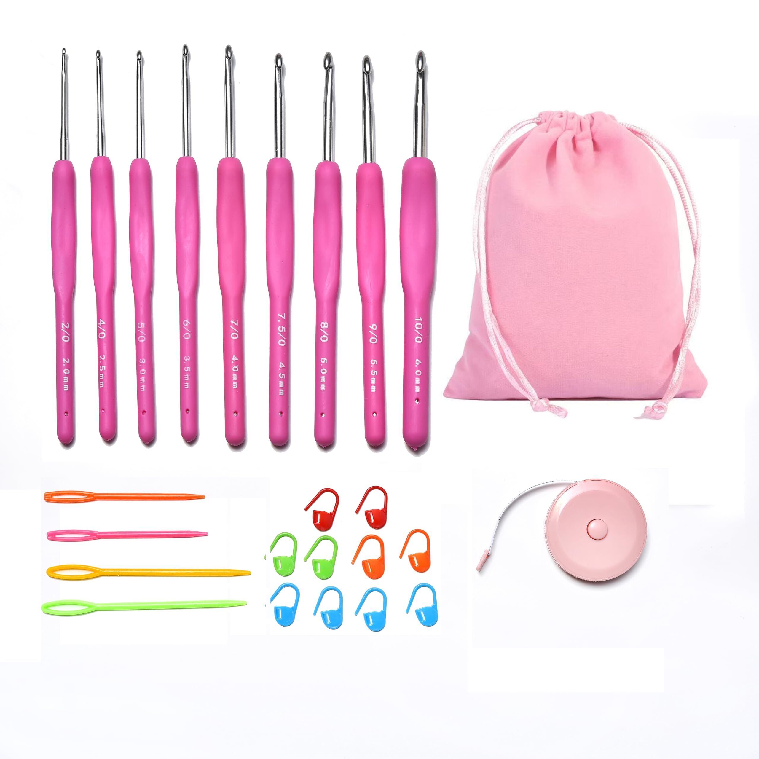 かぎ針 編み針 キット かぎあみ 9本セット 編み物 かぎ針セット 毛糸 DIY 工具 セーター 帽子 初心者 編み物手芸 収納バッグ付き 小物付き 段数マーカー 巻尺 とじ針 小物付き収納でき` (ピンク)