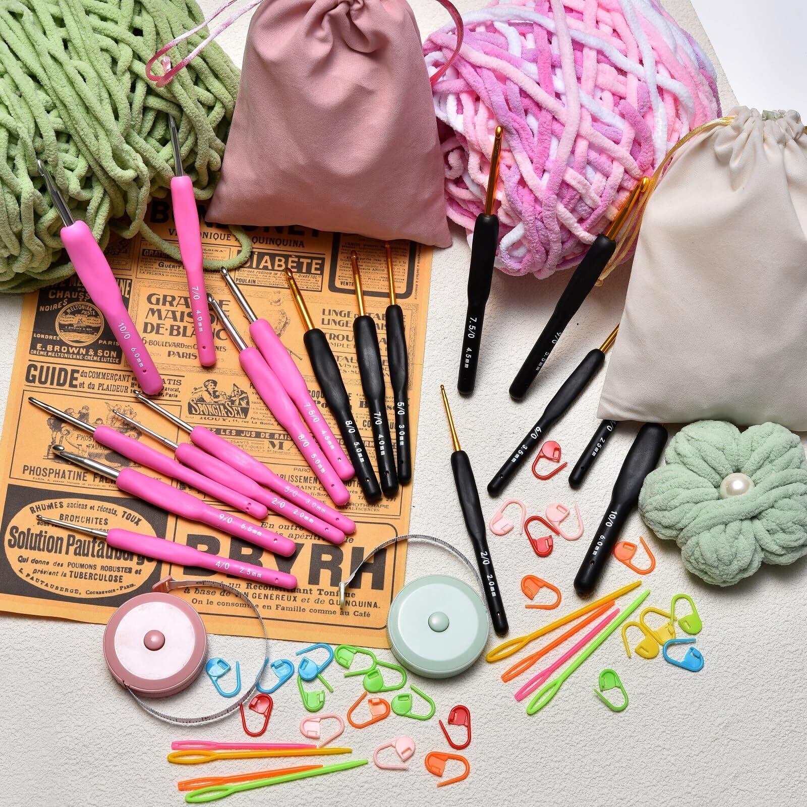 【在庫セール】かぎ針 編み針 キット かぎあみ 9本セット 編み物 かぎ針セット 毛糸 DIY 工具 セーター 帽子 初心者 編み物手芸 収納バッグ付き 小物付き 段数マーカー 巻尺 とじ針 小物付き収納でき` (ピンク)