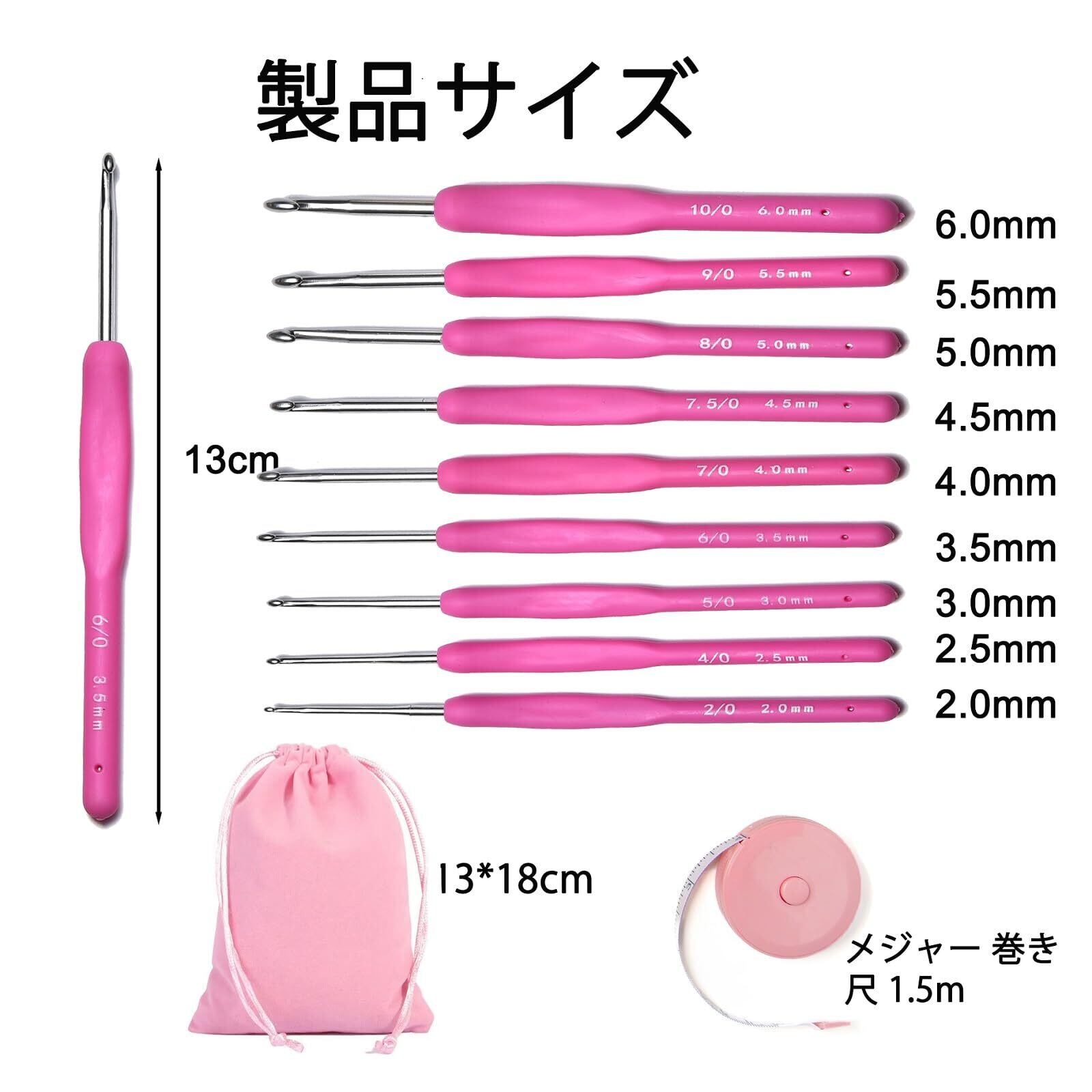 【かぎ針サイズ】太さ:2mm、2.5mm、|3mm、3.5mm、4mm、4.5mm、5mm、5.5mm、6mm。 細いサイズから太いサイズまで揃っていて、手持ちの糸に合わせて使い分けができるので、とても便利です。サイズがそれぞれのかぎ針 編み針に表示されており、初心者でも使いやすいです。