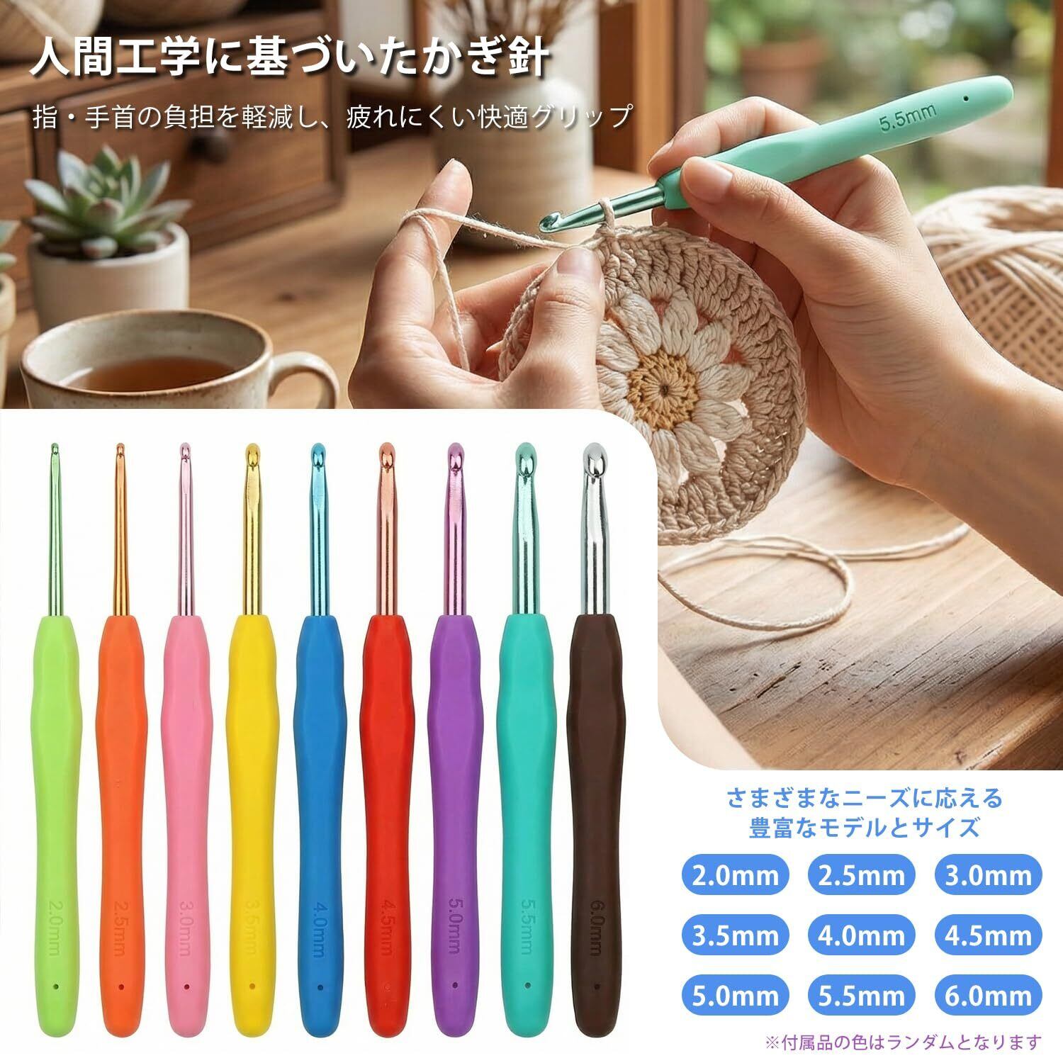 【人間工学かぎ針】セット内のツールは丈夫で耐久性のある素材を採用し、手になじむ使い心地。人間工学に基づいたソフトグリップのかぎ針で指・手首の負担を軽減し、長時間でも疲れにくい設計です。各かぎ針にはサイズ表記がはっきり印字され、号数の見分けも簡単。かぎあみ キット 初心者としても、道具が揃う編み物 キットとしても安心して使えます