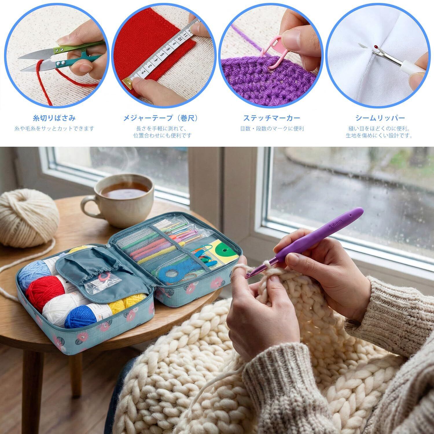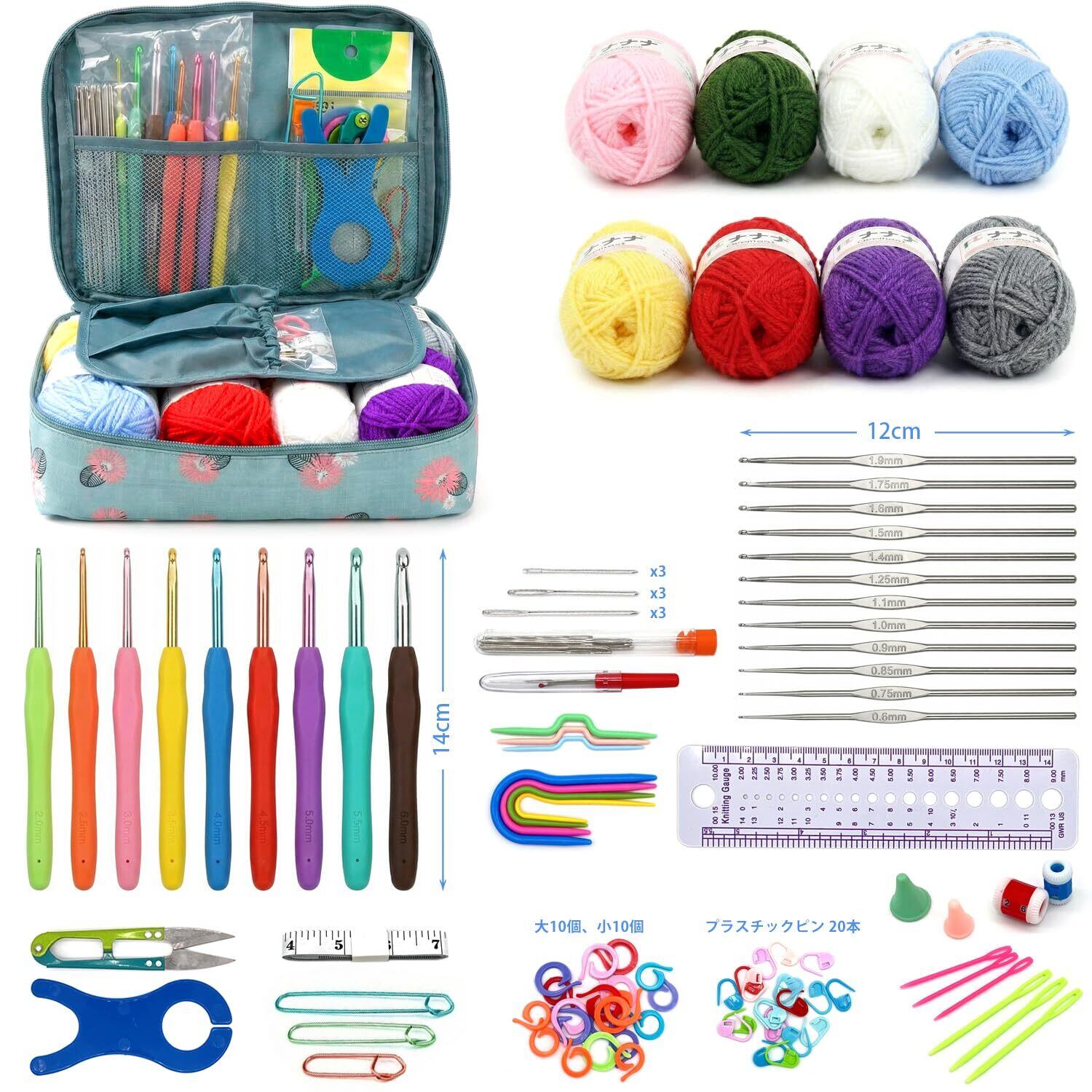 かぎ針編みキット:収納ケース1個,毛糸8個,シリコンハンドル付きかぎ針9本(2.0-6.0mm), 片頭鉄かぎ針12本(0.6-1.9mm), 鈍頭ビッグアイ針9本、プラスチック製ビッグアイ針6本、U字型ピン4本, 巻尺、定規ゲージ 1 個、改ざん防止ピン 3 個、ニードルキャップ 2 個、編み目数段数計2 個,小さなスプリッターナイフ 1 個、スプリットマーカーリング 20 個、チックピンクラスプ 20 個、ワイヤーラップ 1 個、糸ハサミ 1 個、ツイストニードル 3 個、保存袋 1 個