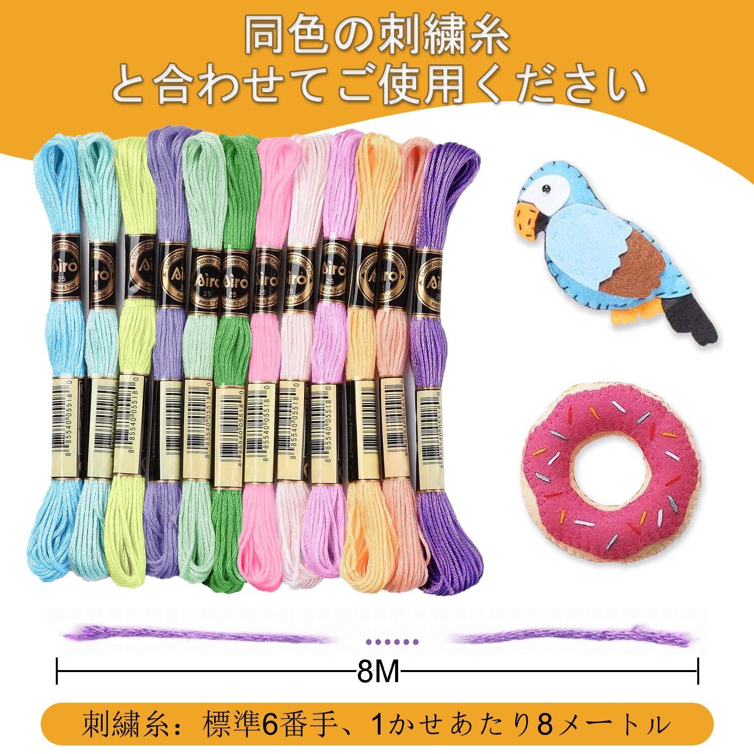 【刺繍糸を含む】ぬいぐるみ 生地セットは8 mの刺繍糸を12巻含み、長さが十分で、繰り返し使用することができます。刺繍糸とフェルト布の色がマッチしており、別途刺繍糸を購入する必要がなく、簡単に刺繍と縫製を完了することができます。