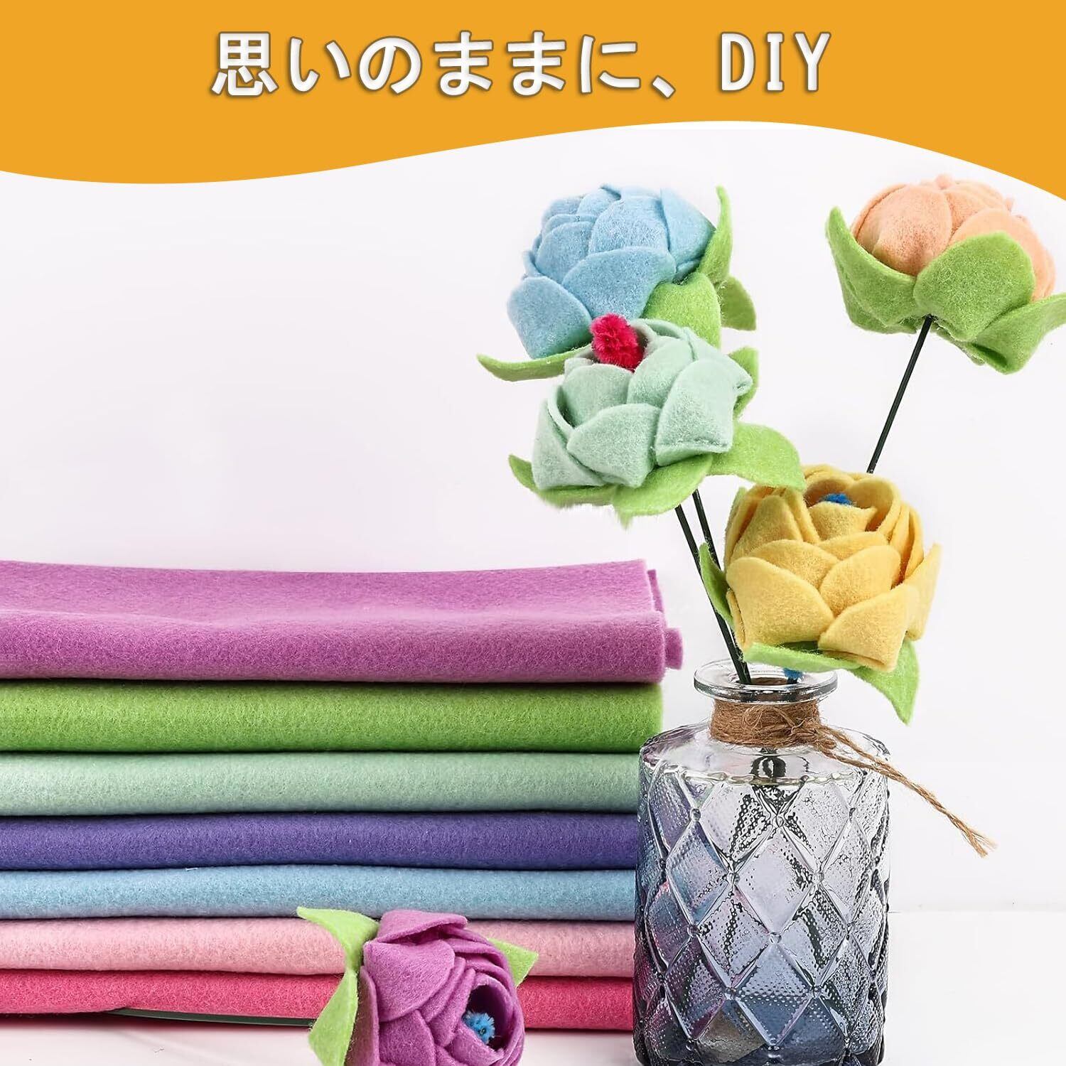 【製品仕様】各フェルト布のサイズは20.5 x 90 cm、厚さは1.4 mm。フェルト布は面積が大きく、小型作品でも大面積作品でも簡単に仕上げることができる。1.4 mmの厚さは柔軟性と耐久性を兼ね備えており、形が崩れにくく、日常生活での使用にも耐えられる。