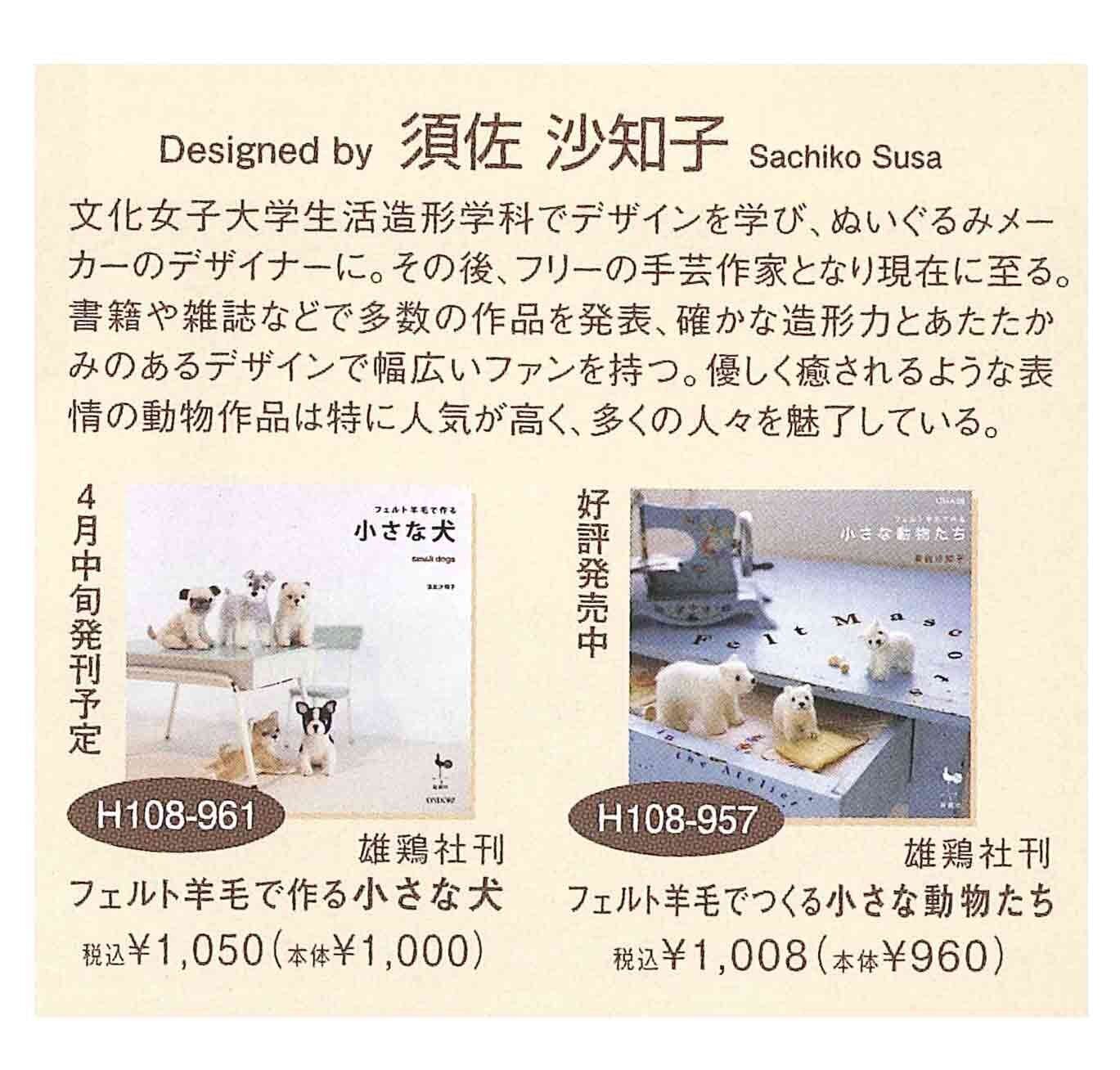 優しく癒される表情の動物作品が人気の“須佐沙知子”さんデザインの、羊毛クラフト好きな人、わんちゃん好きな人も、今すぐ始めたくなるキットシリーズ。いろいろな角度からの、わかりやすい完成写真つきテキスト。