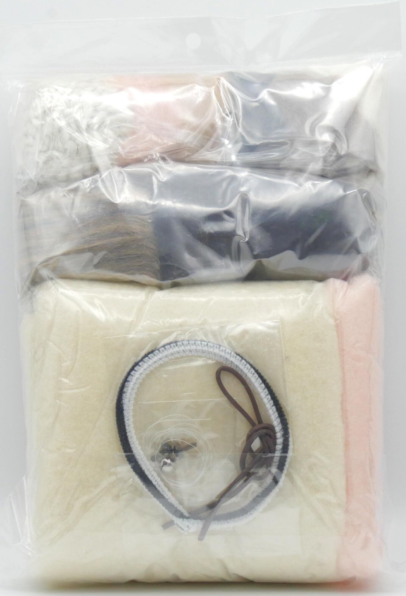 キット内容:ニードルわたわた・フェルト羊毛・植毛ストレート・植毛カール・骨格モール・目・手芸用モール・ヒゲ・ワックスコード・鈴・レッスンブック・実物大ベース写真・完成写真