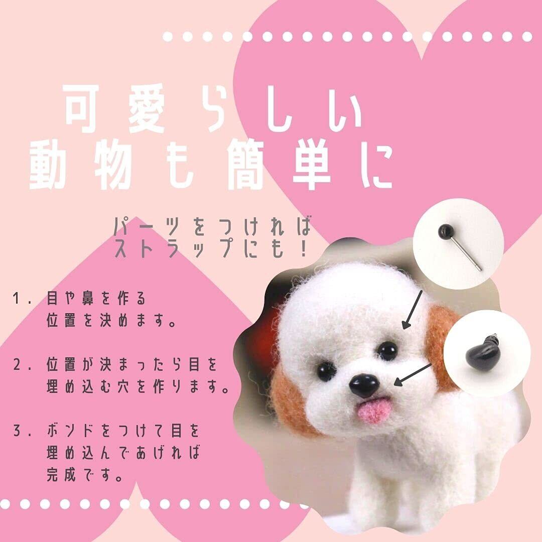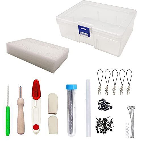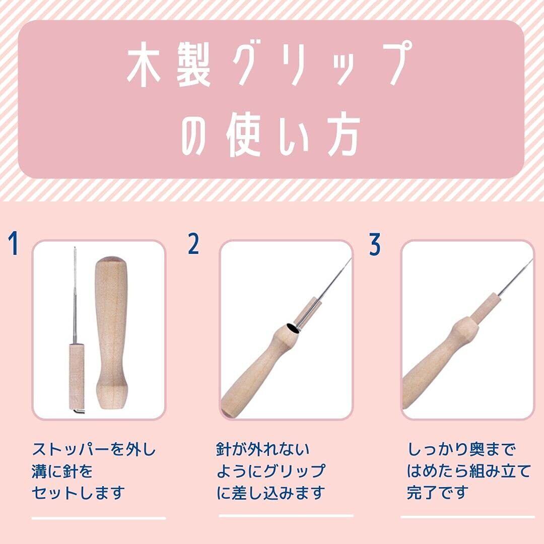 【セット内容】・専用収納ケース(約12x16x6cm) ・針18本(大6本、中6本、小6本) ・木製ハンドル(グリップ) ・ニードルパッド ・糸切りハサミ ・指サック ・千枚通し ・グルースティック ・ストラップパーツ ・リングパーツ ・さし目パーツ ・鼻パーツ