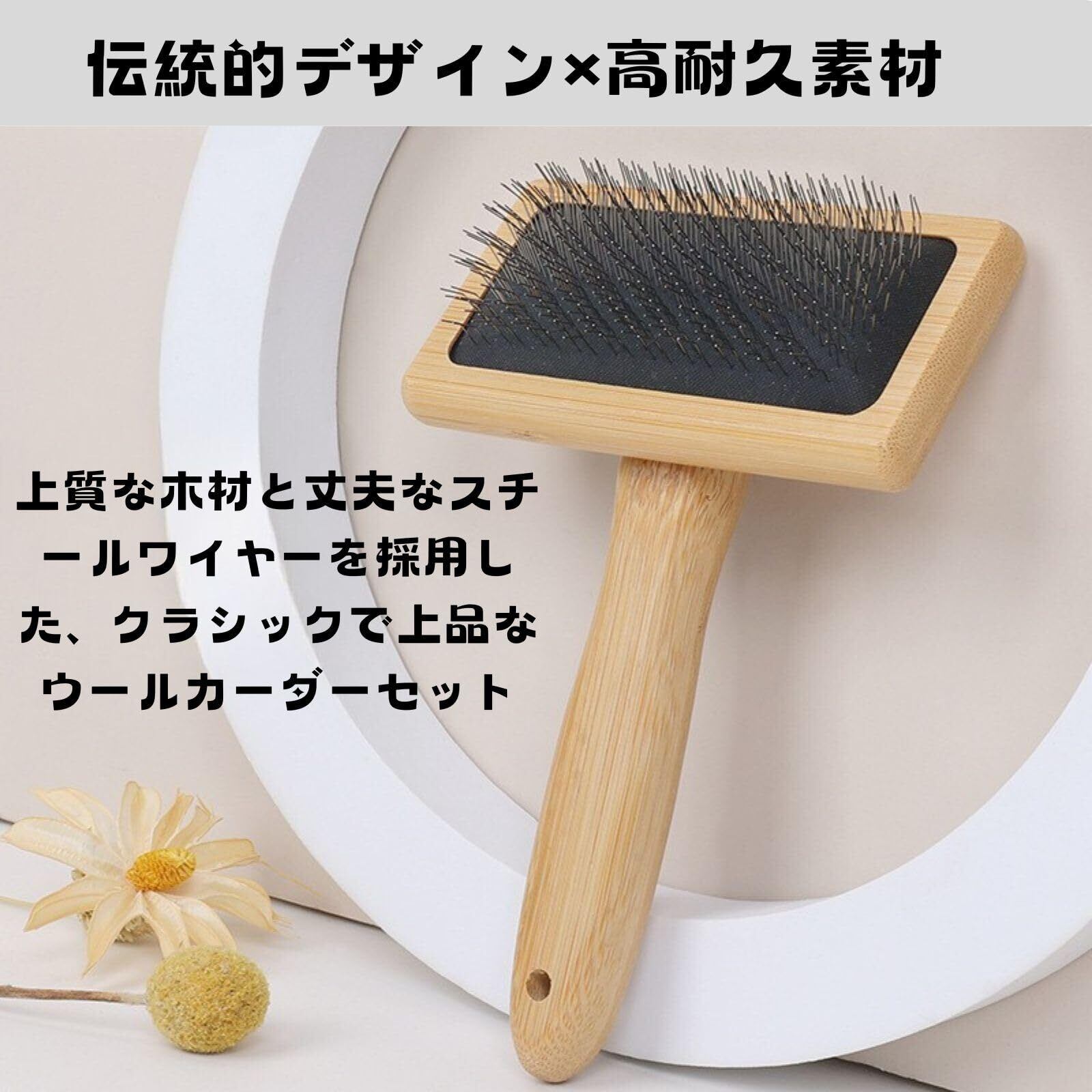 ① 伝統的デザイン×高耐久素材 上質な木材と丈夫なスチールワイヤーを採用した、クラシックで上品なウールカーダーセット。耐久性に優れ、長期間安心してお使いいただけます。毎日のケアに最適な実用ツールです。