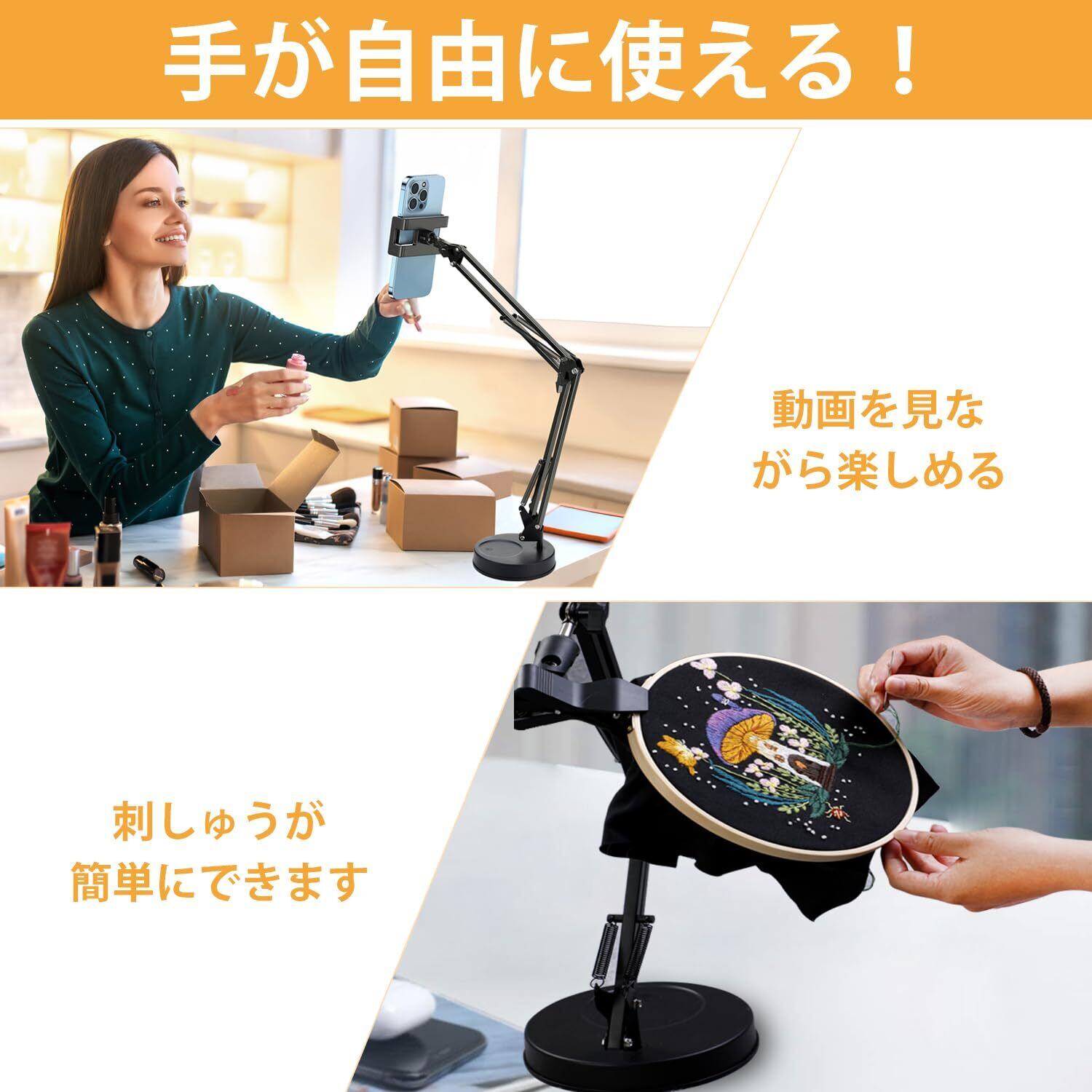【両手が自由に使える便利さ】 刺繍枠を手で持つ必要がなく、スマホスタンドとしても活用可能。手が疲れず、リラックスした時間を過ごせます。