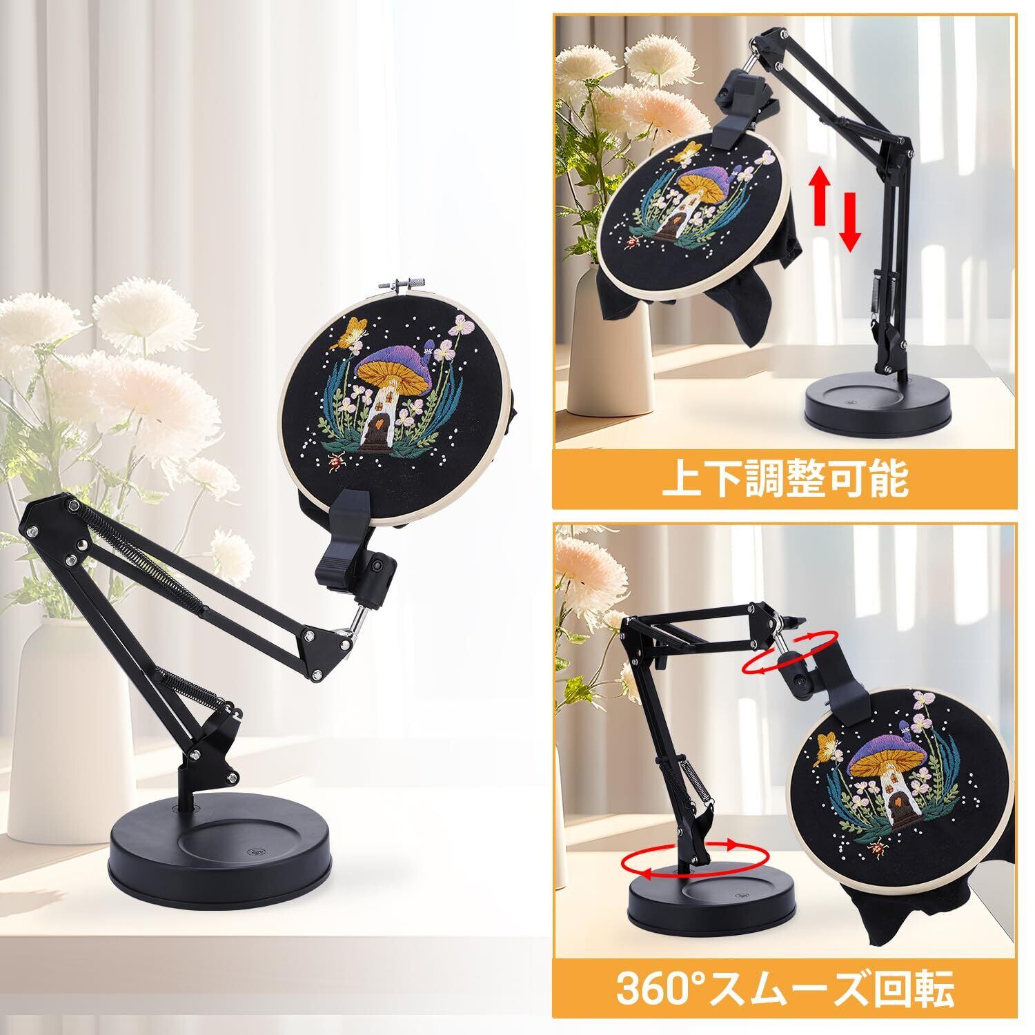 【フルアジャスタブル設計で快適な作業】 360度回転可能なスタンドで、高さと角度を自由に調整可能。あらゆる刺繍プロジェクトに最適なエルゴノミックな姿勢を実現します。