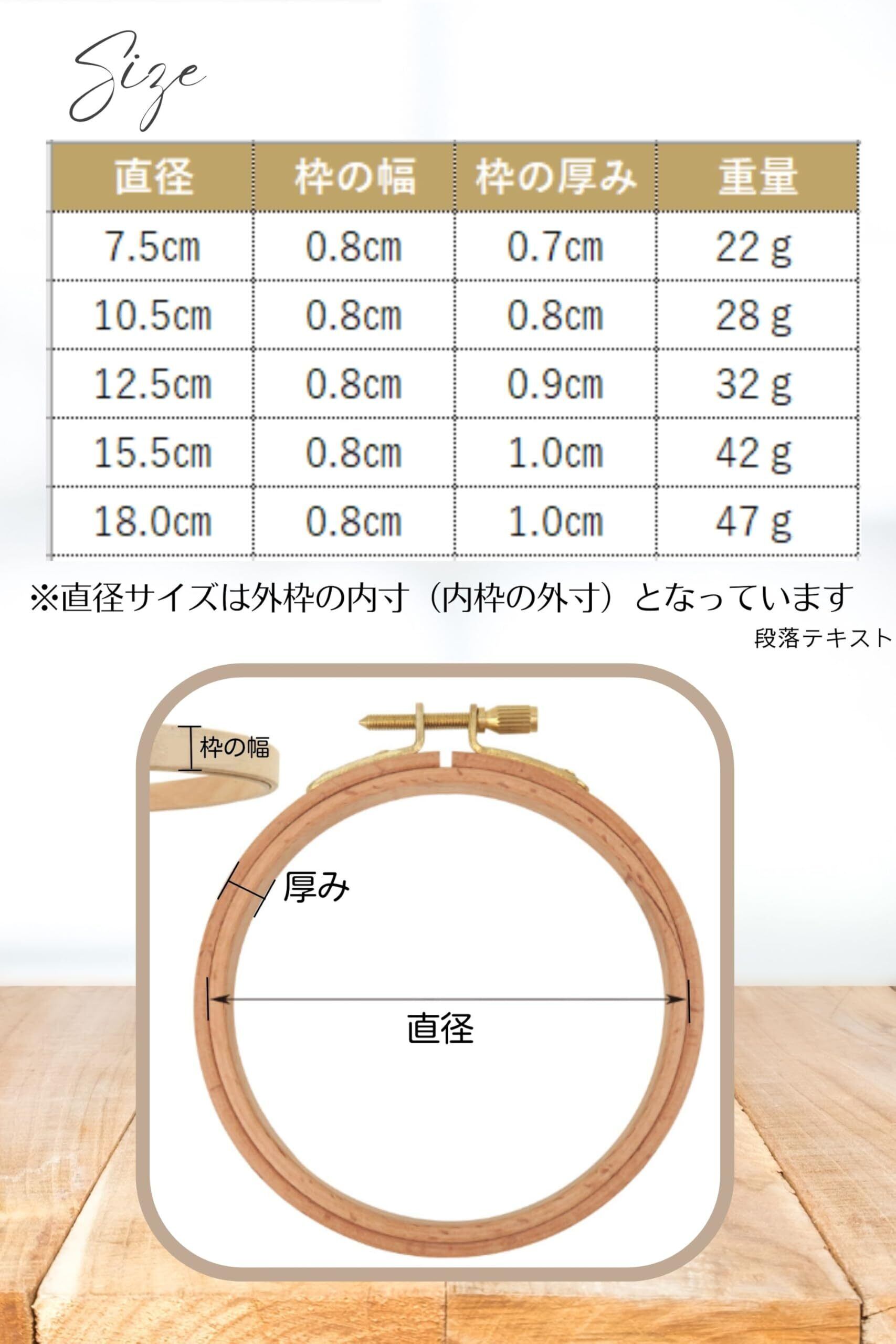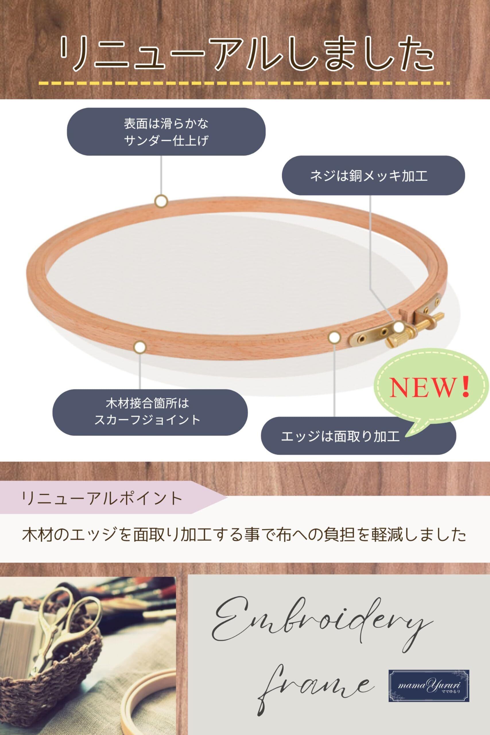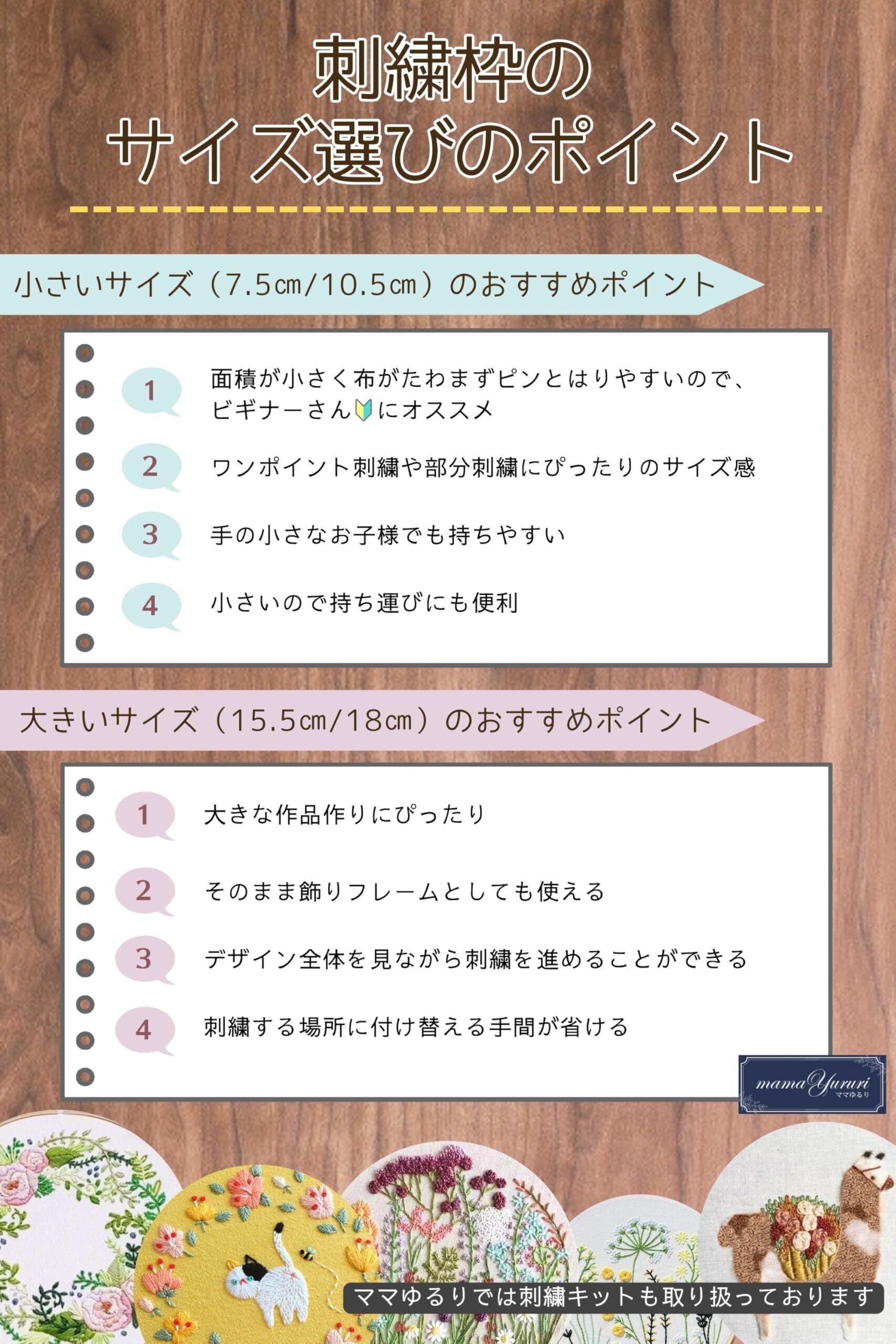 高級ブナ材の木製刺繍枠です。 刺繍枠を使うメリットは、布をピンと張ることでしわが寄りにくくなり安定して針を通しやすくなるので、刺繍作業に集中して作品をきれいに仕上げられる点です。 特に木製の刺繍枠は木のしなる特性により、布を張った状態でしっかりホールドできます。 中でも「ブナ材」は特に丈夫で、使えば使うほど手にも馴染んできます。 良い物を長く使いたいという方にオススメの刺繍枠です。 7.5㎝や10.5㎝など小さな刺繍枠はワンポイント刺繍や手の小さな方やお子様に、 15.5㎝や18.0㎝など大きな刺繍枠は大きな図案を刺繍される方に最適です。
