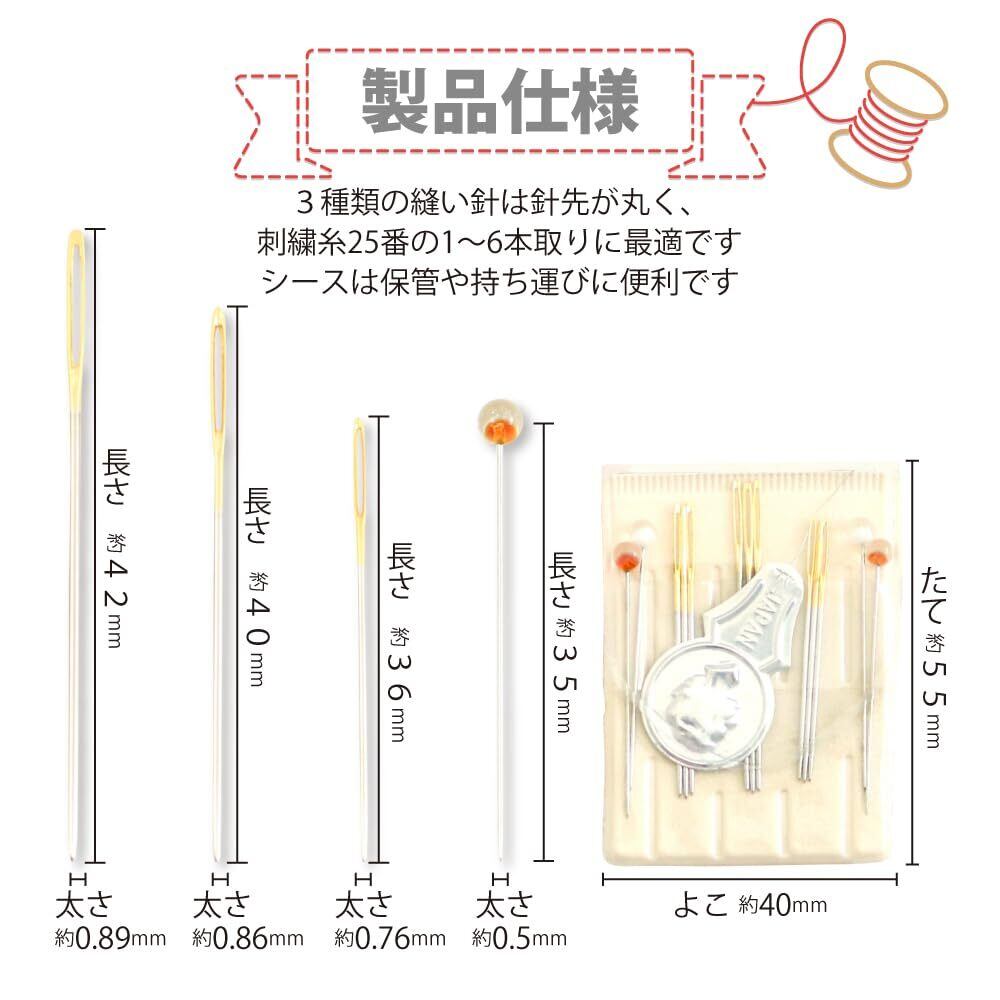 針サイズ:長さ40mm×太さ0.86mm 3本入;刺繍糸25番の2~4本取りに最適な針サイズです。