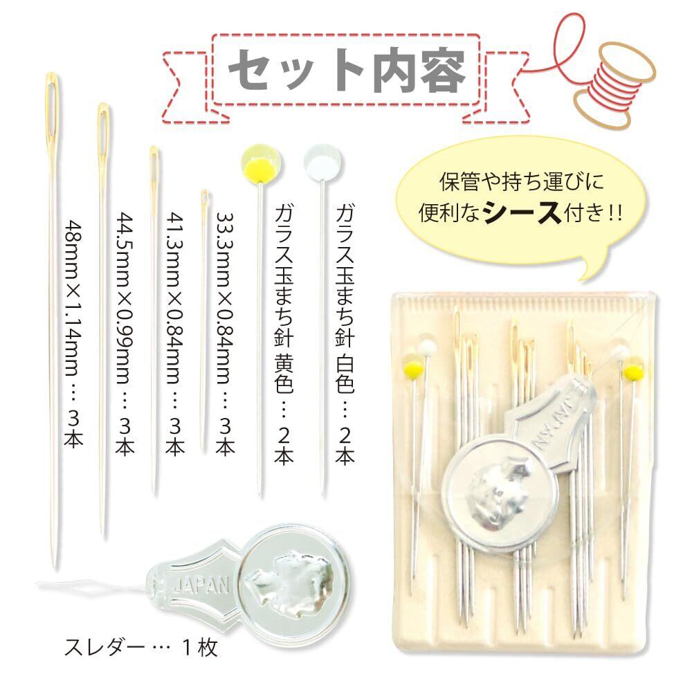 付属品として、2色のガラスがかわいいまち針、スレダー(糸通し)、シースがセットになった使いやすい刺繍針セットです。