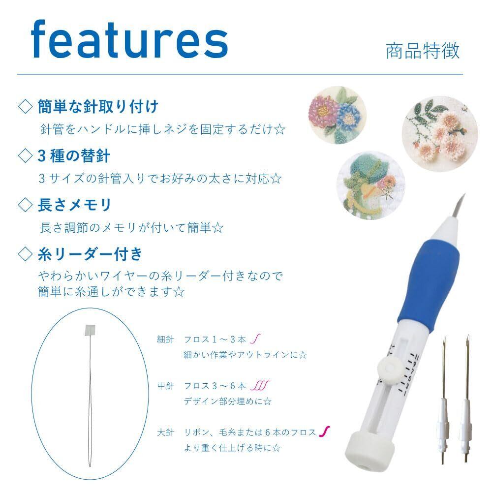 【3種の替え針入り】 細針、中針、太針の3本が入っており 作業に合わせて太さを変えられるので 色々なデザインを楽しむことができます。