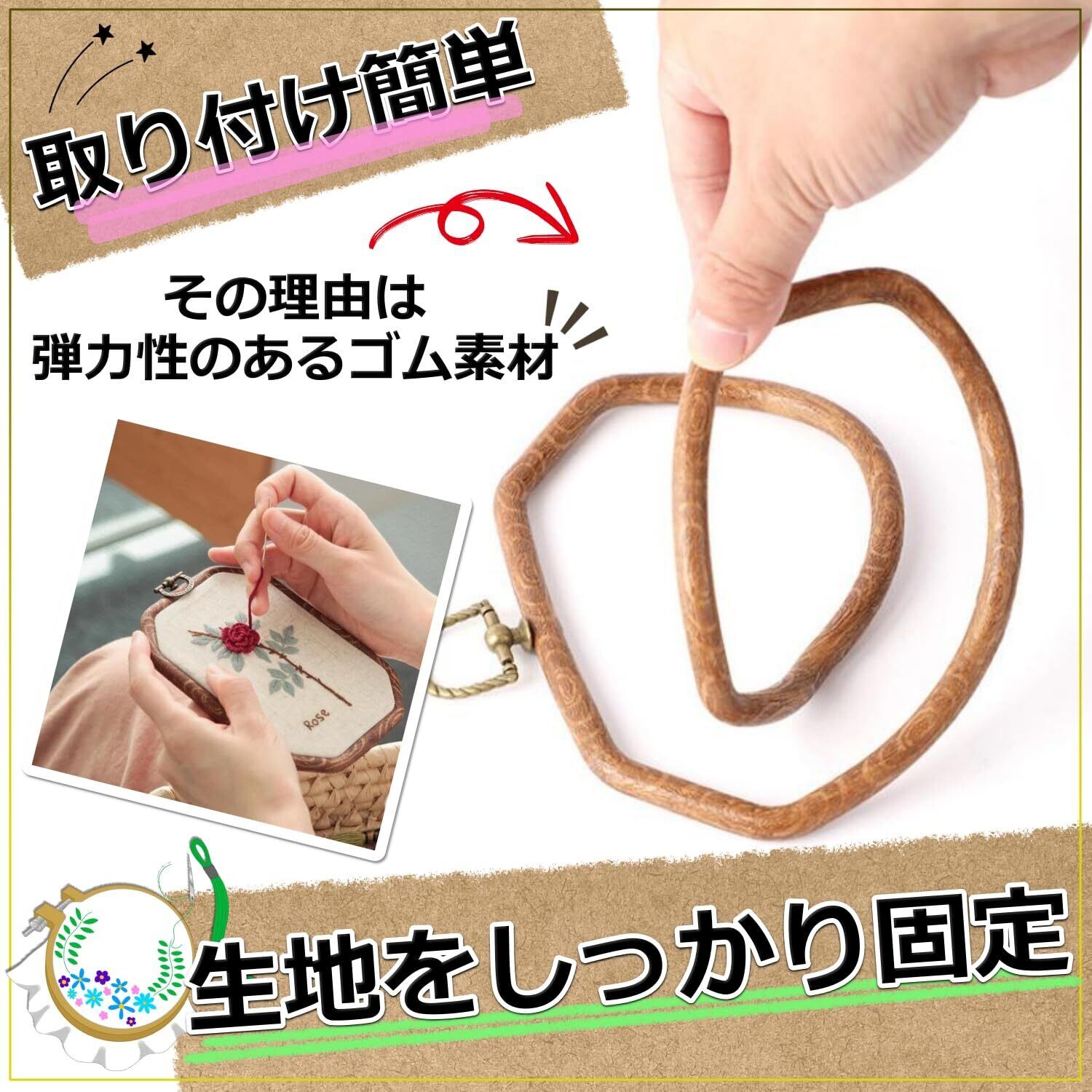 木目調の外枠はゴムのような樹脂素材につき、僅かな力で曲げ可能。プラスチックや木製の枠に比べ取り付け・取り外しが簡単で、生地をしっかり押さえます。