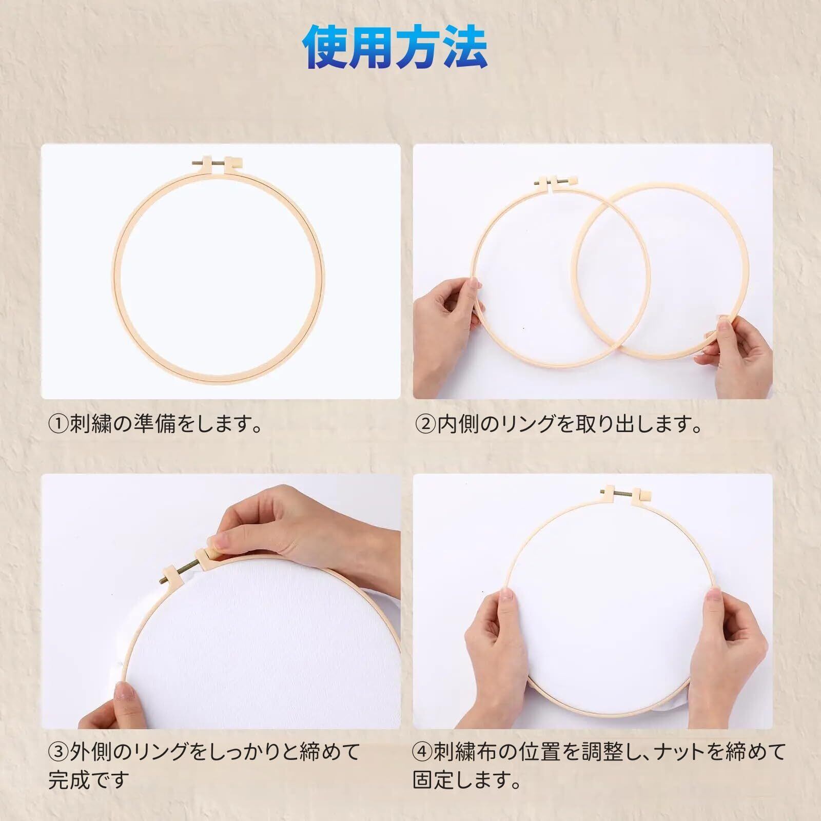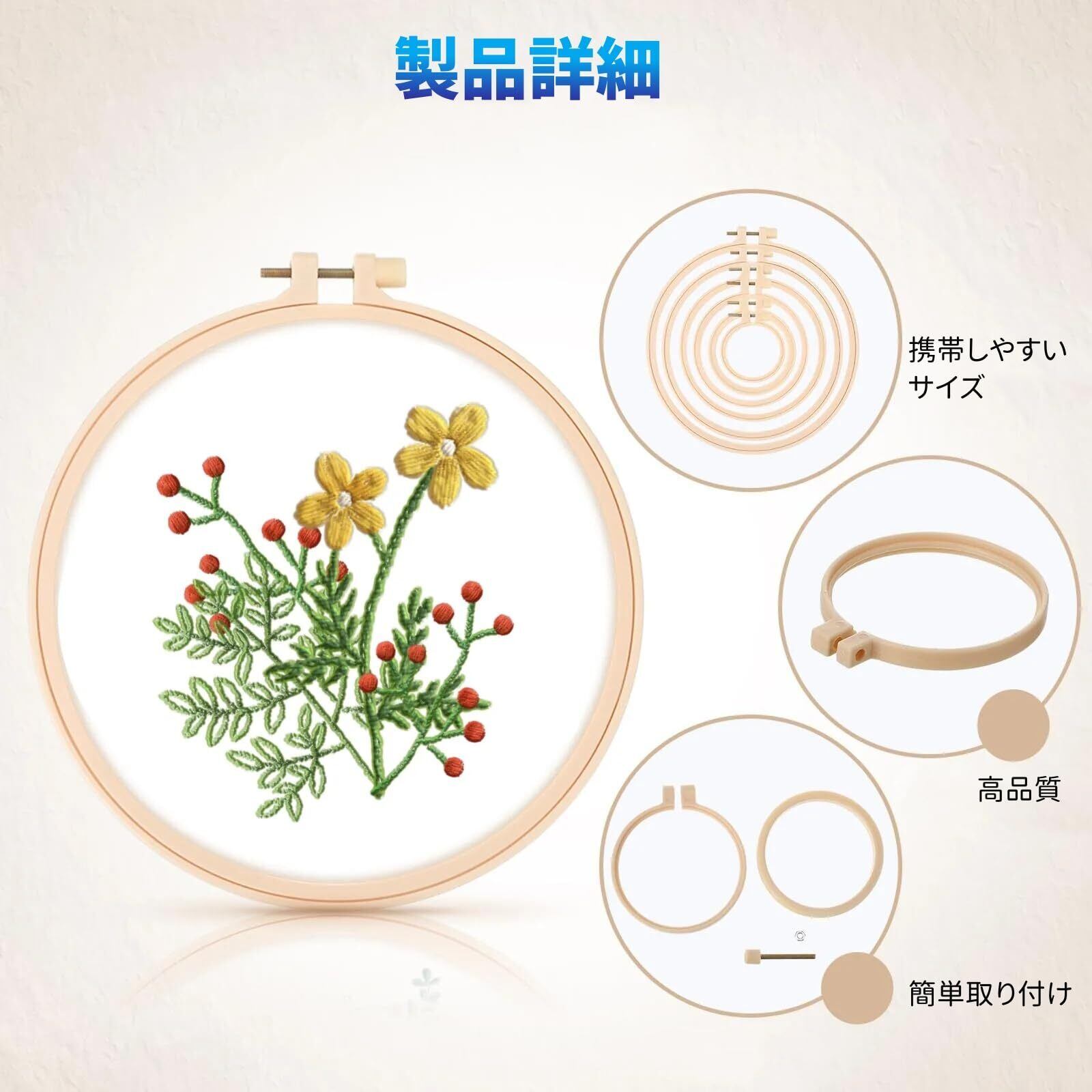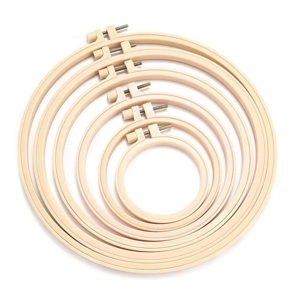 【刺繍枠セット】サイズ:9.5cm、12.5cm、16.5cm、20cm、24cm、27cm。1パックには合計6個が含まれており、それぞれサイズが異なるため、さまざまなシーンや目的に合わせて選択できます。家庭用から作業用まで幅広く対応し、必要に応じて最適なサイズを手軽に利用できる便利なセットです。