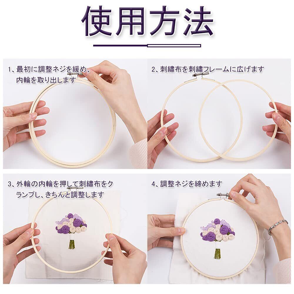【使用方法】1、最初に調整ネジを緩め、内輪を取り出します。2、刺繡布を刺繡フレームに広げます。3、外輪の内輪を押して刺繡布をクランプし、きちんと調整します。4、調整ネジを締めます。