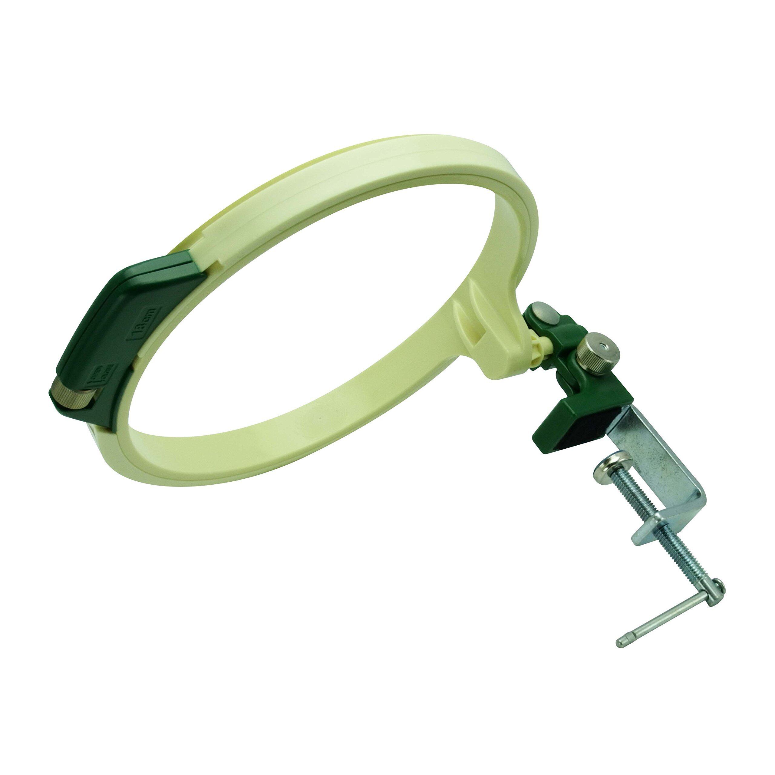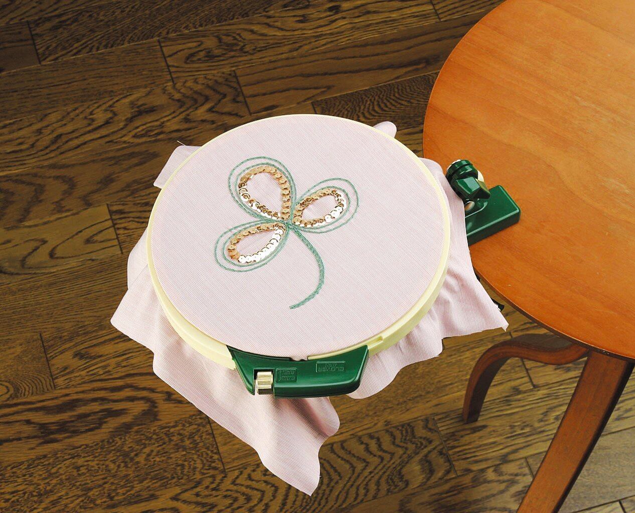 机に取り付けて使用する方式なので、両手をフリーにして使用できる。手元で360度回転するフープ(刺しゅう枠)。裏向けが簡単で、糸の始末やステッチの確認に便利。生地をしっかりはさみ、張りを保つ。