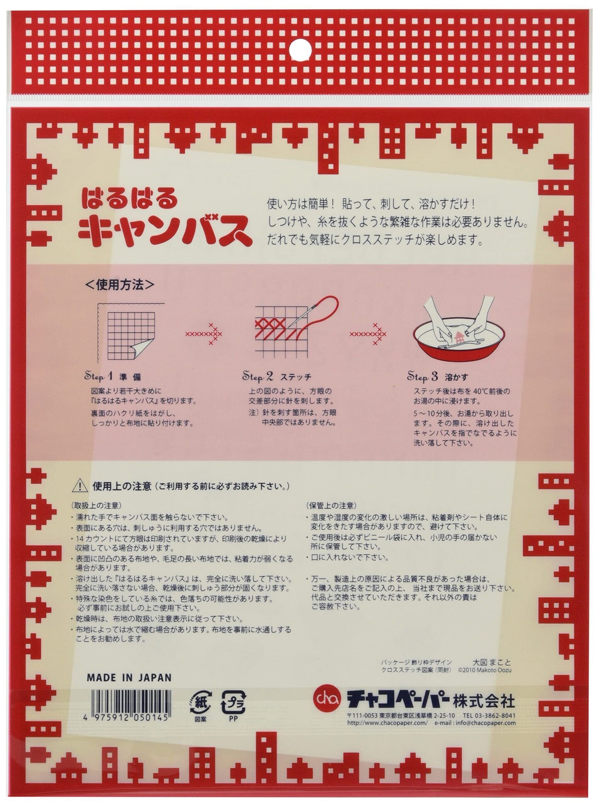貼ってはがせる刺繍用 シール タイプ のキャンバスです。使い方は簡単!貼って、刺して、溶かすだけ!しつけも、糸を抜くような繁雑な作業は必要ありません。だれでも気軽に クロスステッチ が楽しめます。一般的な「抜きキャンバス」のように、しつける必要はありません。 シール が貼れる 布 地であれば、どこへでも 刺繍 が出来ます。貼るだけだから、曲面でも簡単。
