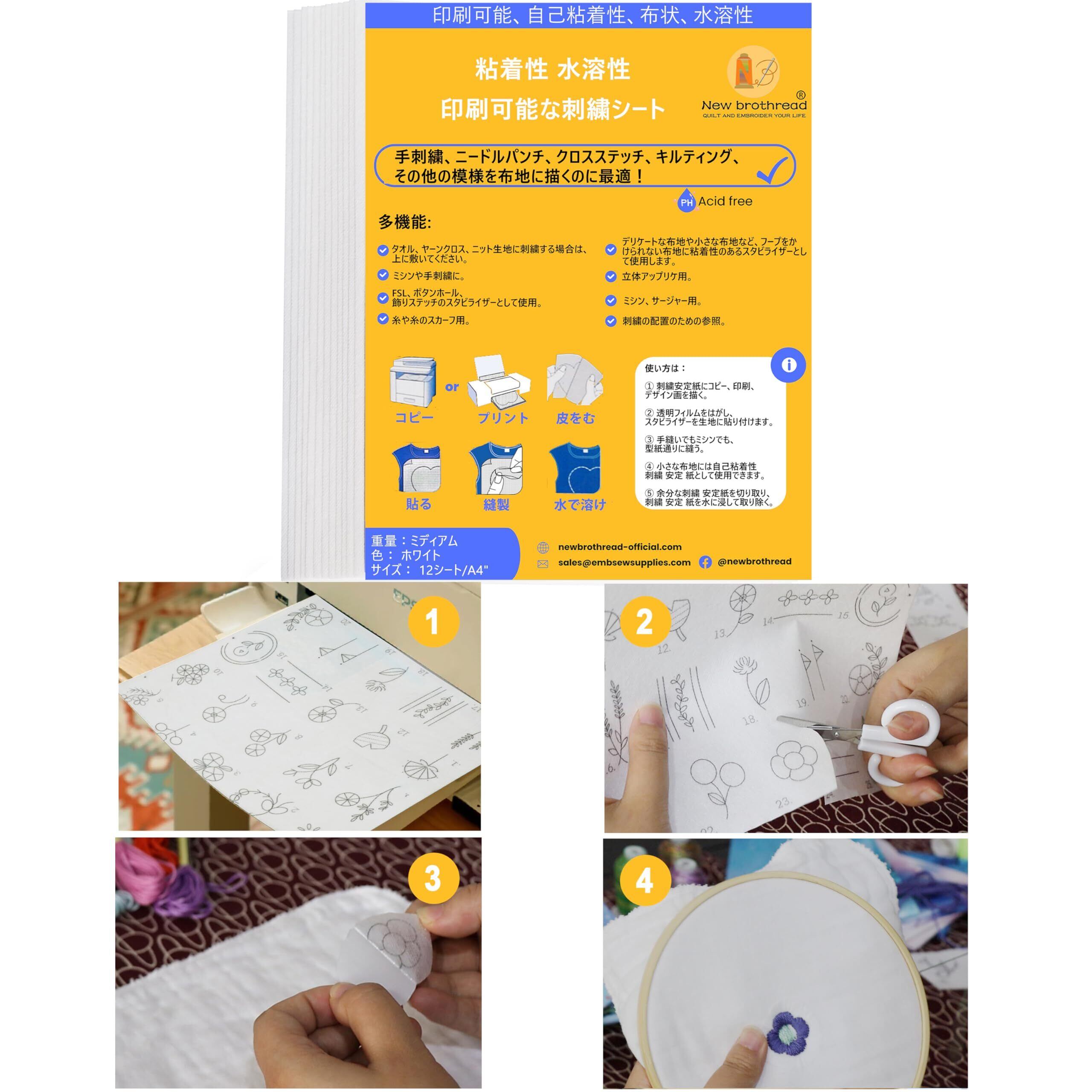 【特価商品】New brothread 12枚 A4 (29.7x21cm)粘着刺しゅう用水溶性シート 刺繍に 水でとける 下絵シート 印刷可能な刺繍紙 刺しゅう安定紙 手刺繍とミシン刺繍に適したパターンを印刷し、描くことができます