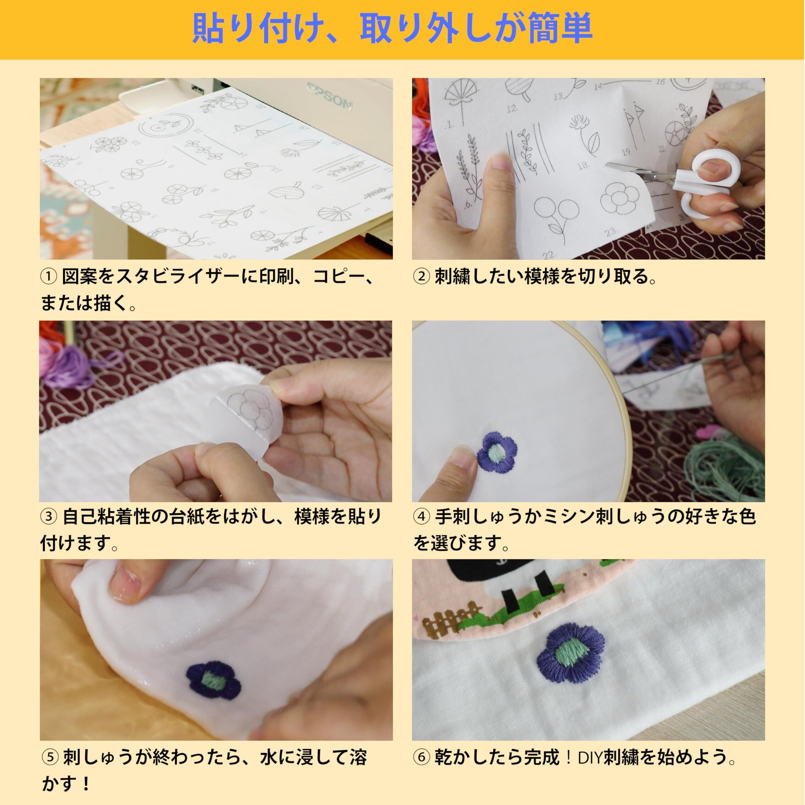 【用途】1. 刺繍したい柄を台紙にプリントする; 2. 裏紙をはがすだけで、プロジェクトエリアに貼り付けます; 3. ステッチを始める; 4. ぬるま湯に浸すかすすいで紙を溶かし、優しくこすって乾かします。5. 通常の水溶性バッキングとして使用できる。