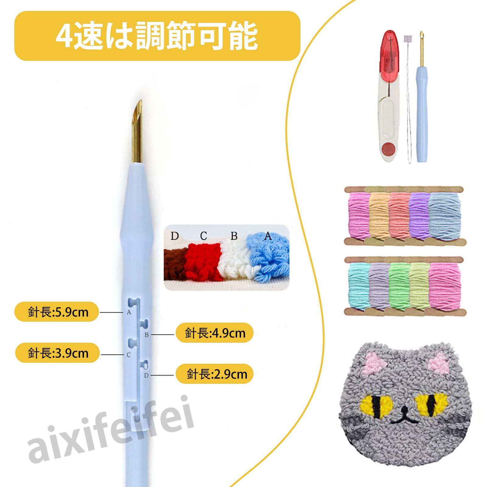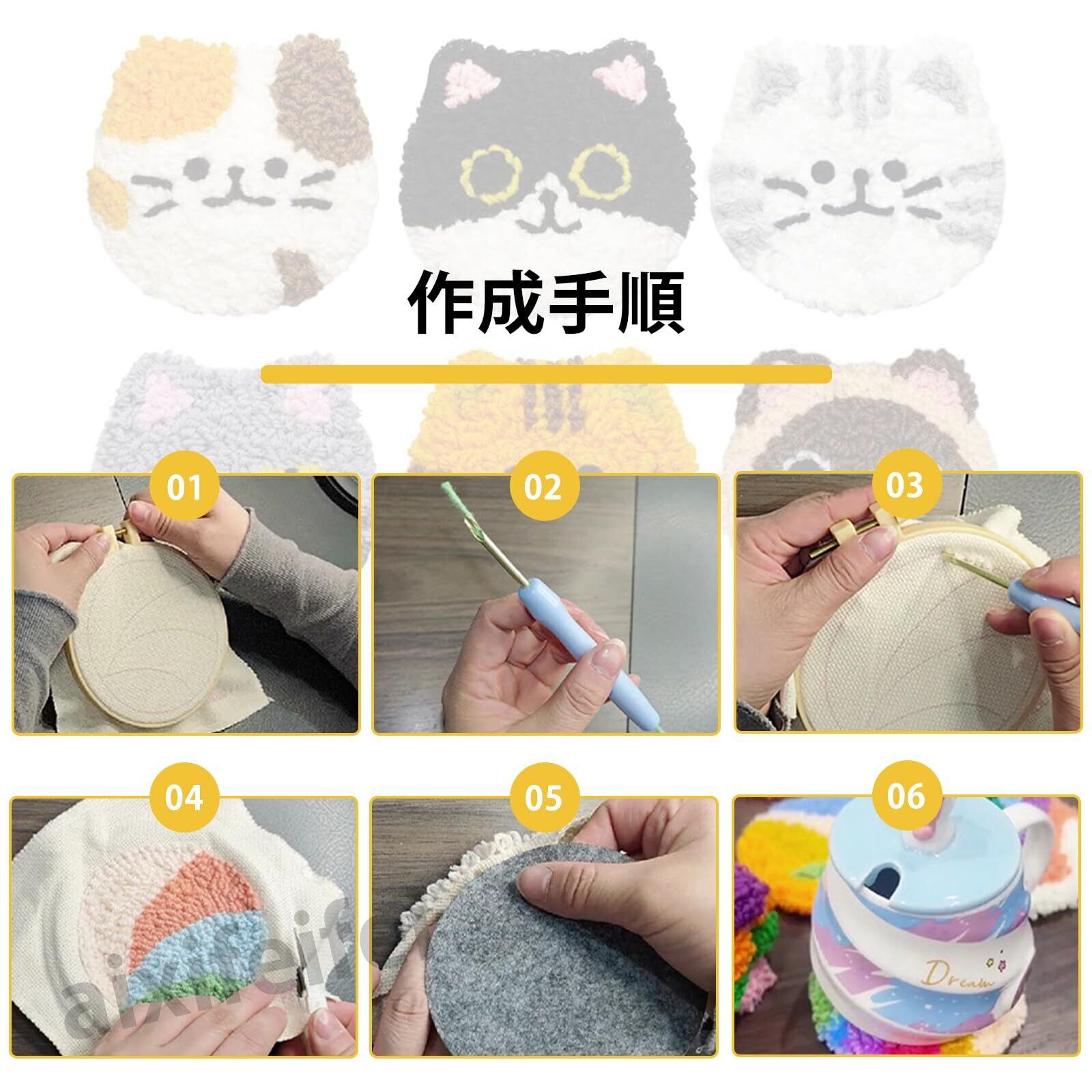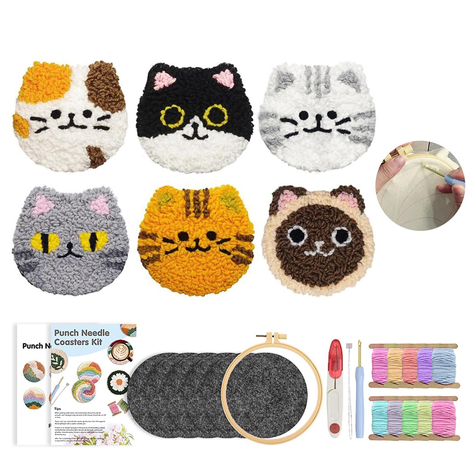 ADOFUN パンチニードル 材料道具キット コースター材料キット ニードルパンチ 刺繍 手芸材料セット 刺繍枠 ニードルペン 図案 布セット 製作説明書付き 6 点セット (A)