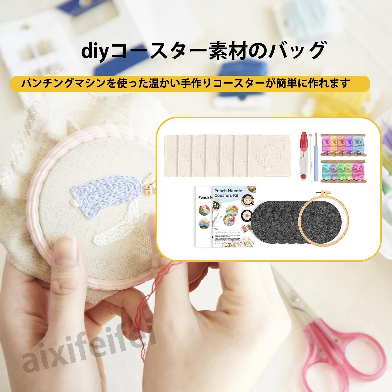 【数量限定】ADOFUN パンチニードル 材料道具キット コースター材料キット ニードルパンチ 刺繍 手芸材料セット 刺繍枠 ニードルペン 図案 布セット 製作説明書付き 6 点セット (A)