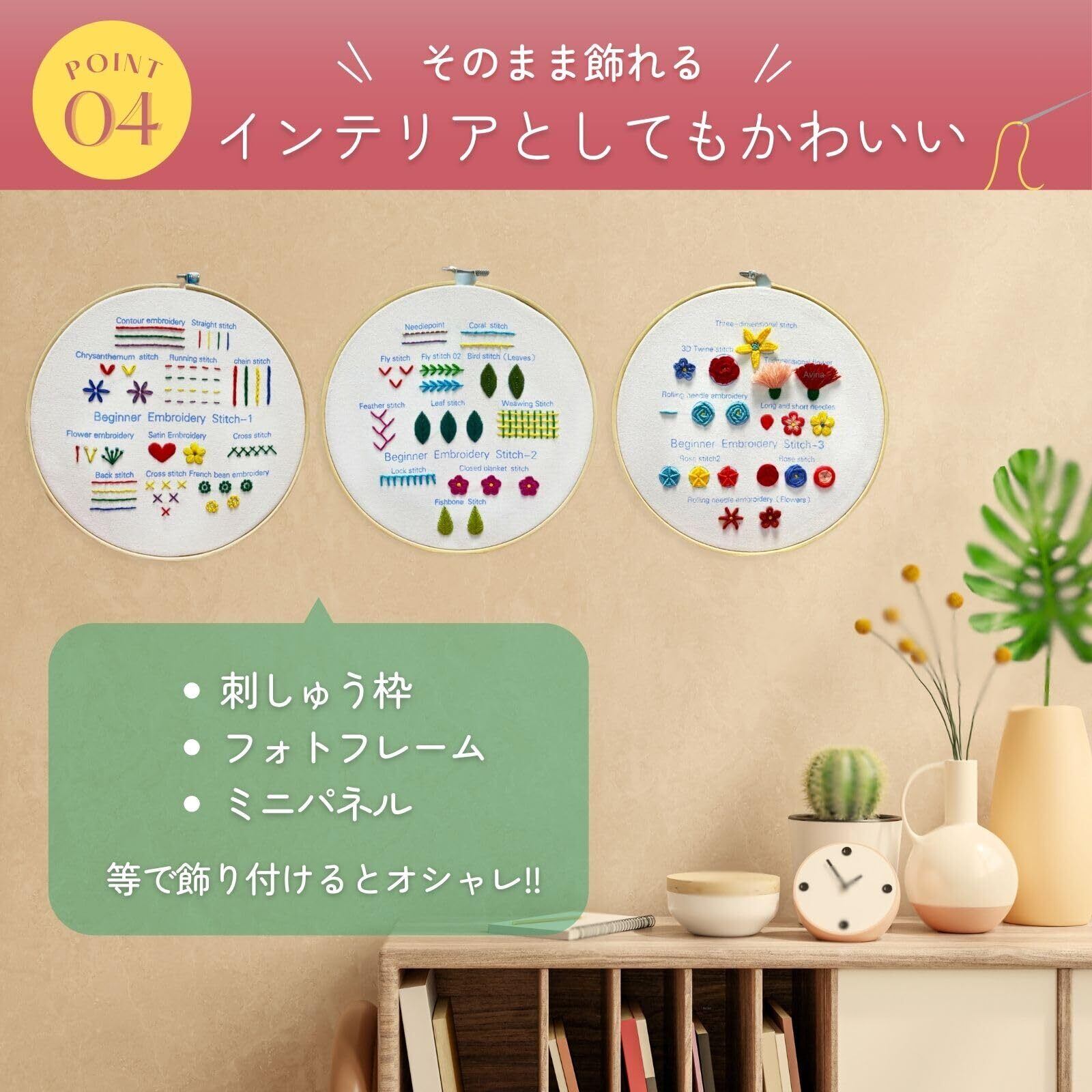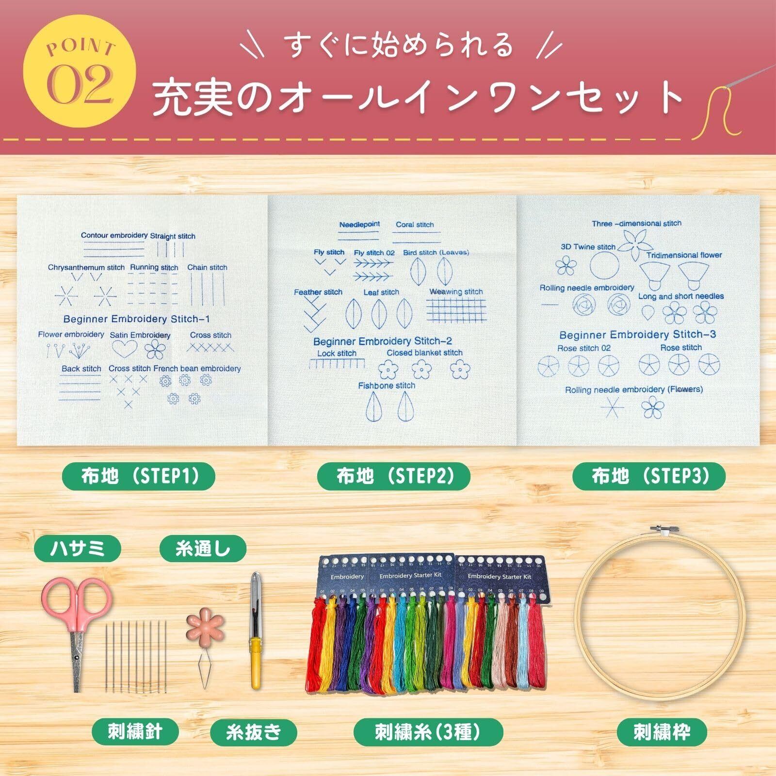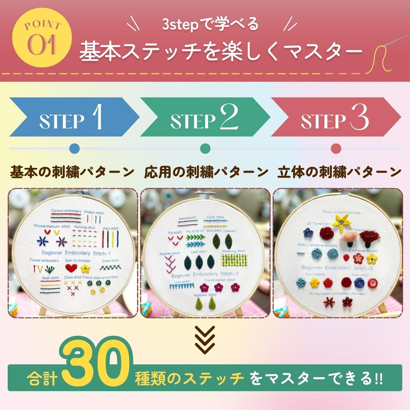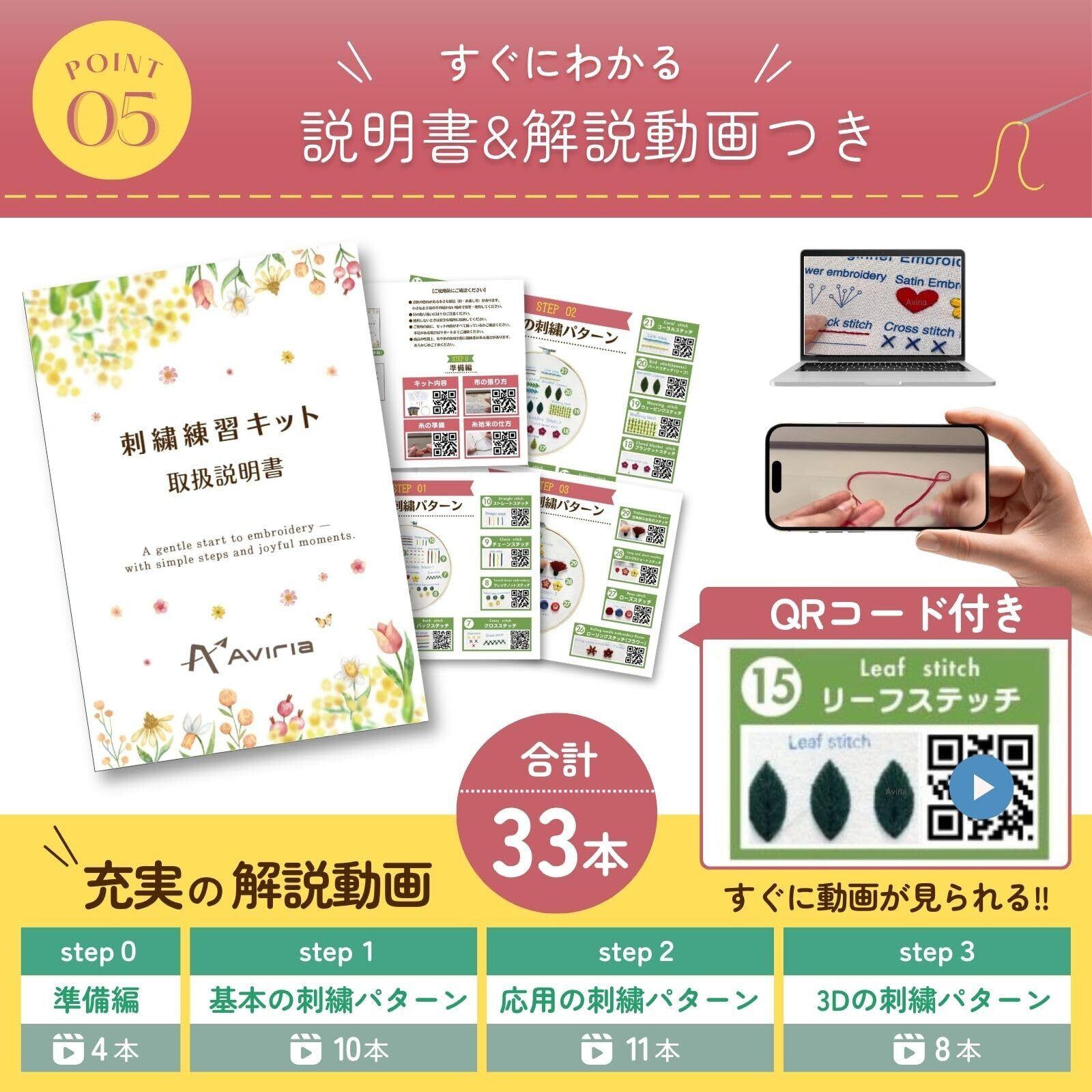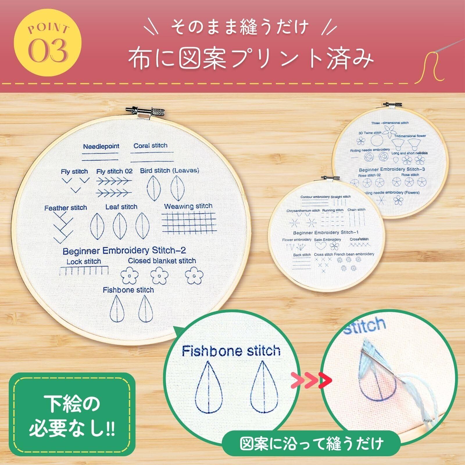 Aviria 刺繍キット 初心者 セット| 練習布3枚・刺しゅう針9本・刺しゅう糸22束・木枠・日本語説明書&解説動画付|基本のステッチ30種対応 |クロスステッチ 北欧 手芸 ハンドメイド 入門 ギフト スターターセット