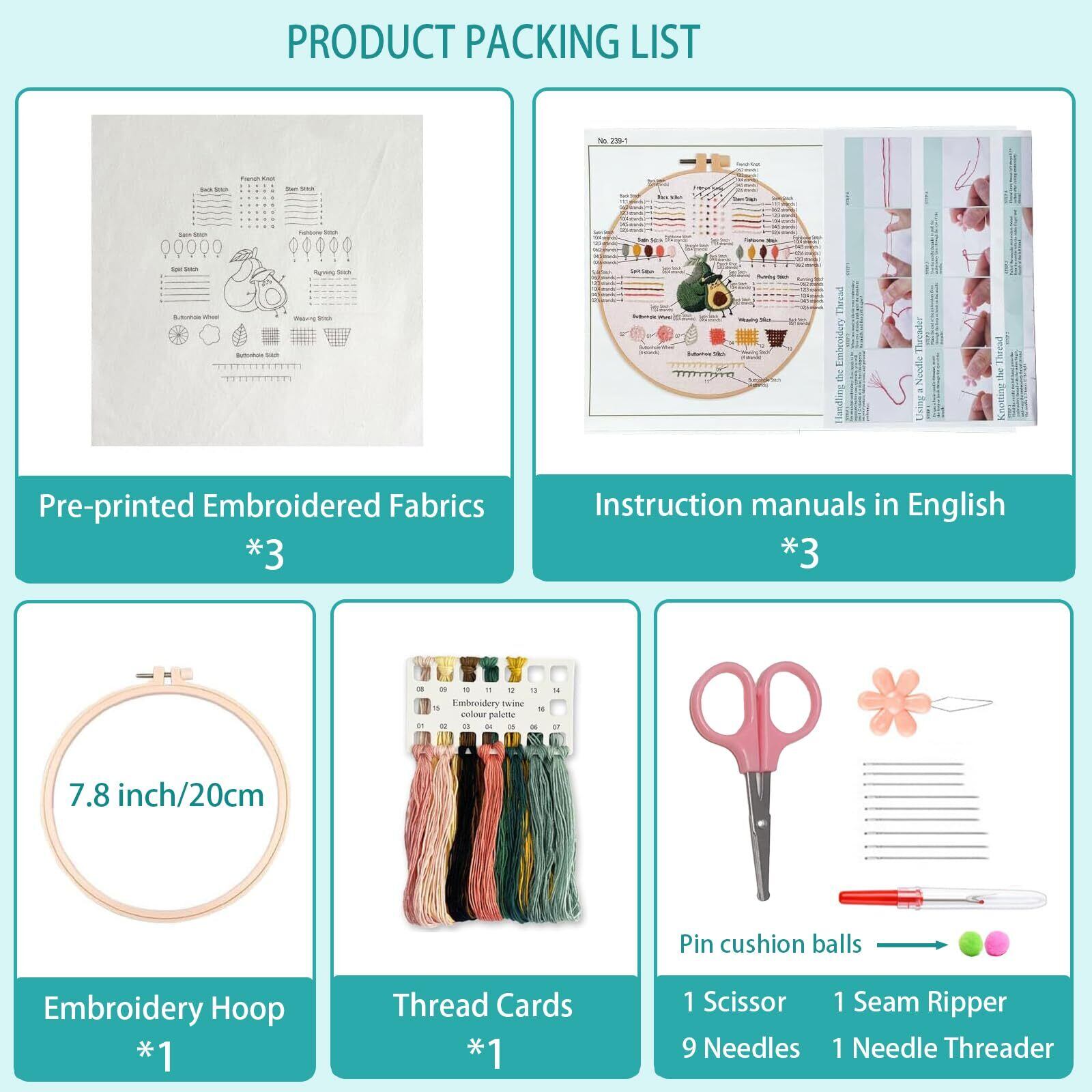 【針仕事用縫製スターターキット】8インチの刺繍フープ×1、プリント済み生地(約12×12インチ)、糸、針、英語の説明書、その他のアクセサリーツールが含まれています。