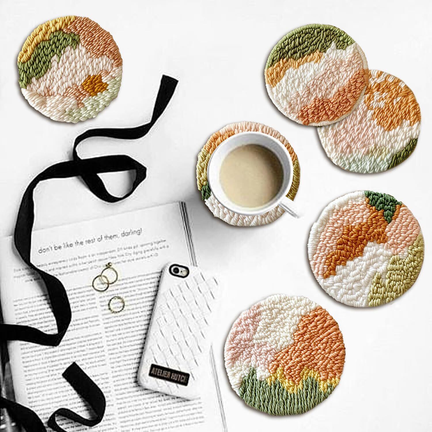 【特価商品】パンチニードルコースターキット DIY 粘着性フェルト・糸・刺繍フレーム付き 家庭用手芸材料包 製作説明書付き 6 点セット (A)