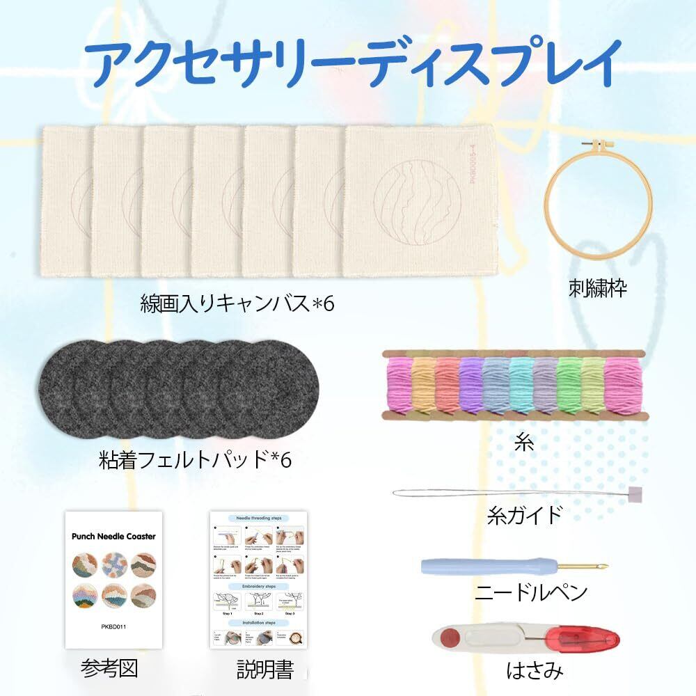パンチニードルコースターキット DIY 粘着性フェルト・糸・刺繍フレーム付き 家庭用手芸材料包 製作説明書付き 6 点セット (A)