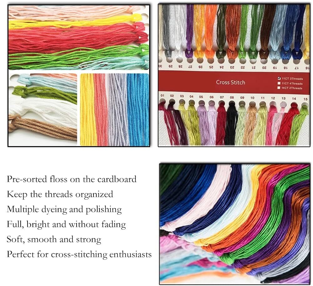 クロスステッチのニードルポイントキットには、すぐに刺繍を始めるために必要なアクセサリー(非常に高品質)がすべて含まれています:環境に優しいプレプリント生地、十分な事前に選別された糸、針、わかりやすい表と英語の説明書。