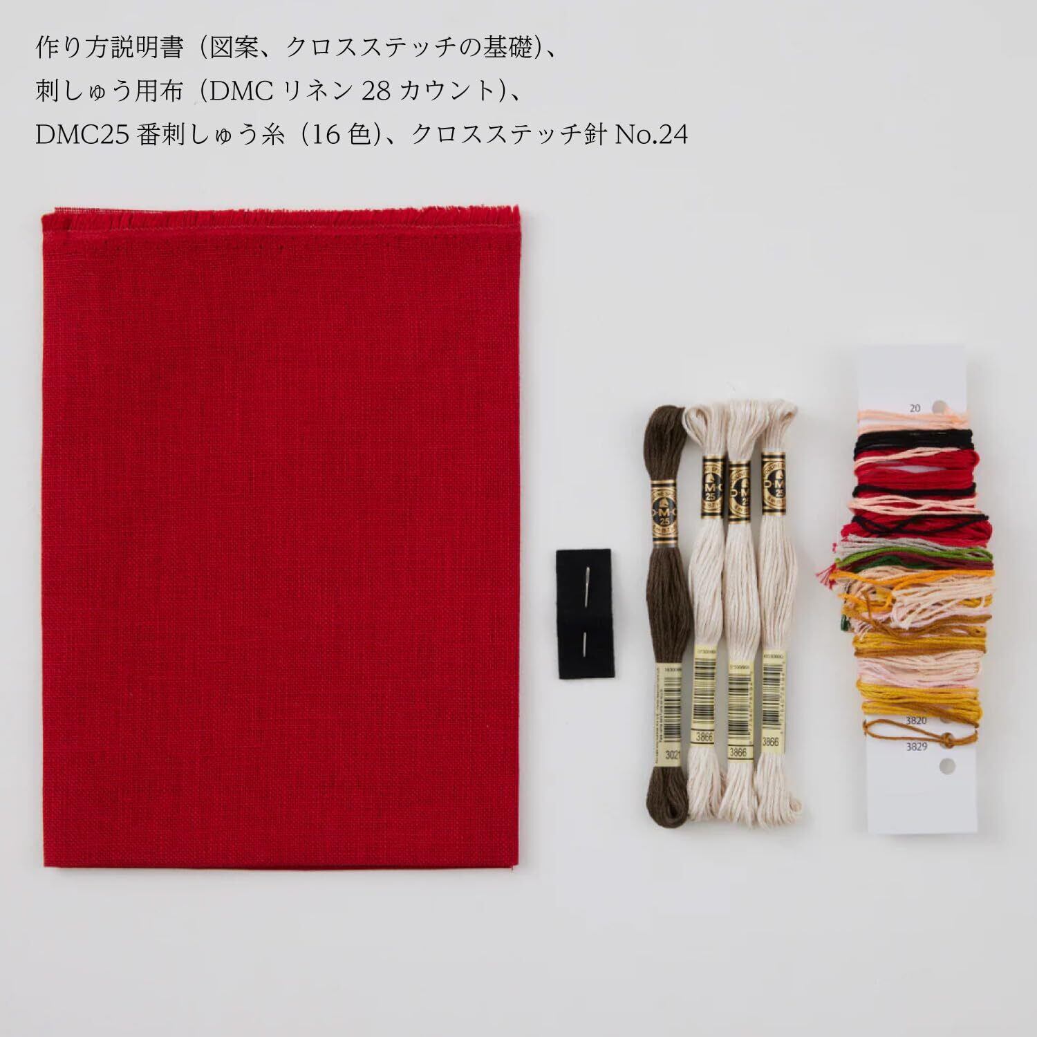 【内容】作り方説明書(図案、クロスステッチの基礎)、刺しゅう用布(DMCリネン28カウント)、DMC25番刺しゅう糸(16色)、クロスステッチ針No.24