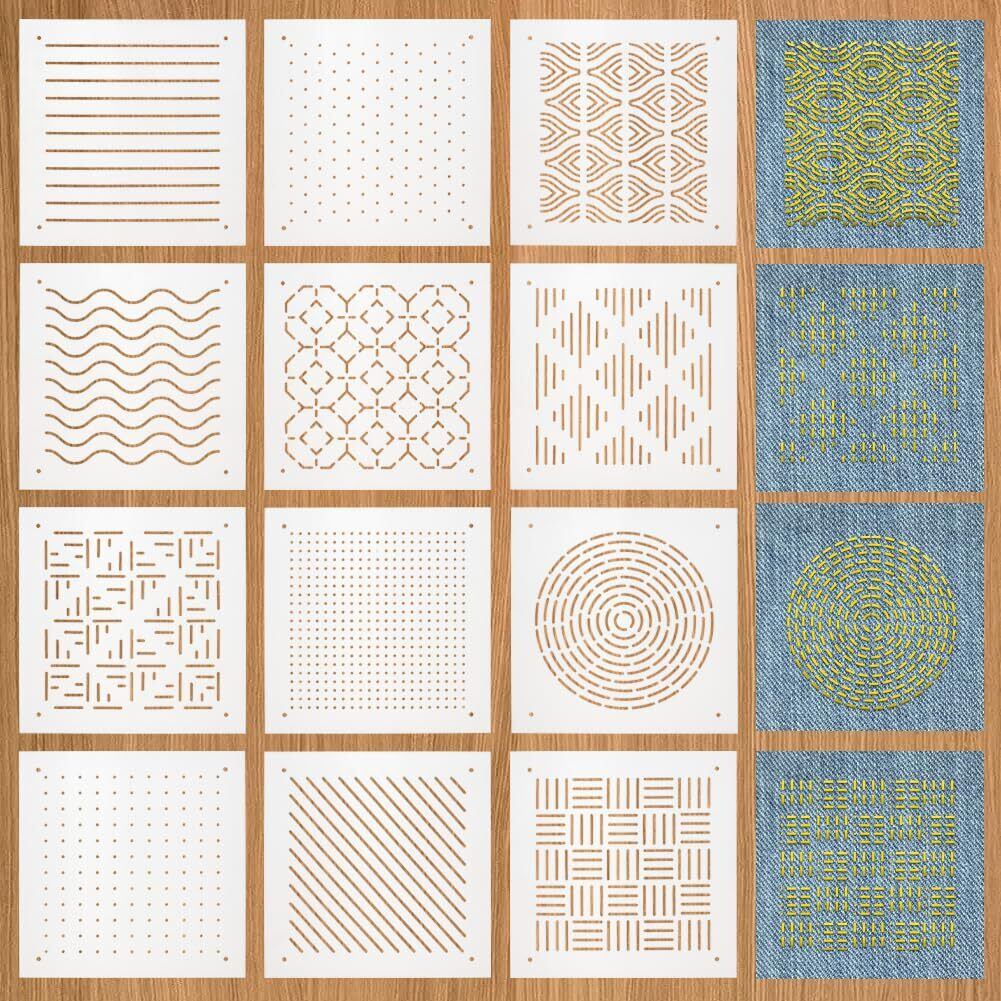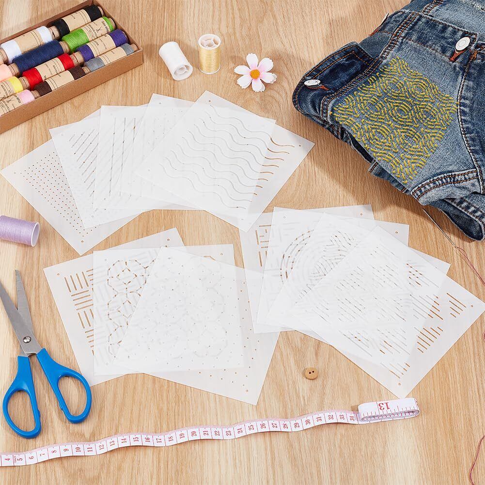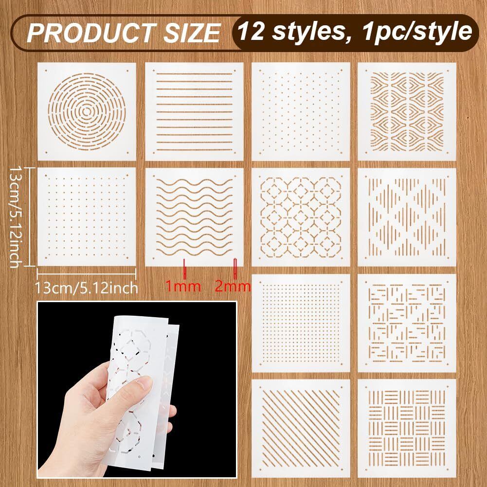 BENECREAT 12枚 刺繍ステンシル 13x13cm 厚さ0.3mm 刺し子ステンシル 点、ライン、ウェーブ、スラッシュなど12スタイル PET 描画線テンプレート 刺し子テンプレート 刺繍ツール ハンドキルティング用