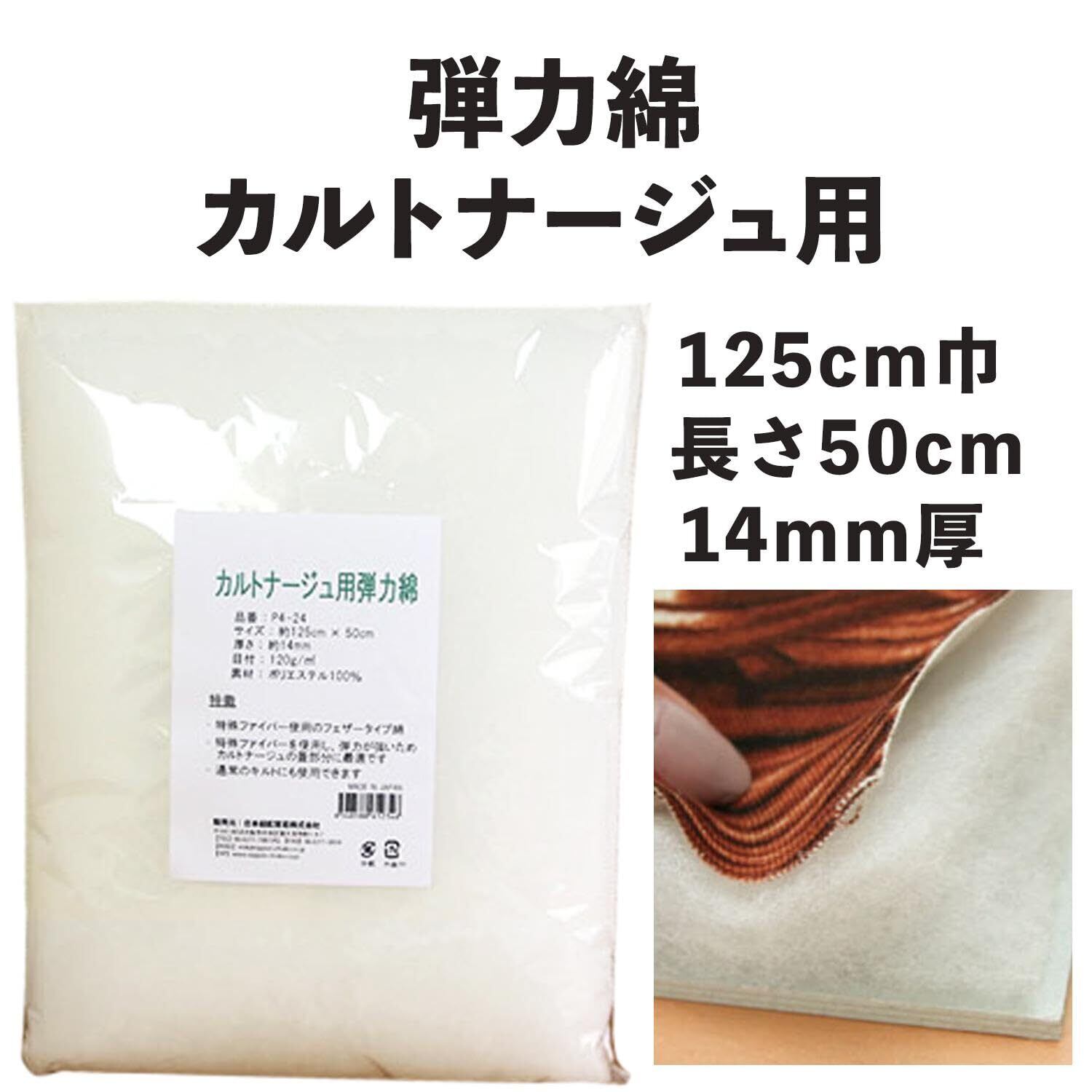 ■サイズ:巾125cm 厚さ14mm ×50cm 目付120g/m2■素材:ポリエステル100%■特殊ファイバー使用のフェザータイプ綿で弾力が強く、カルトナージュのフタに最適。通常のキルトにも使用できます。