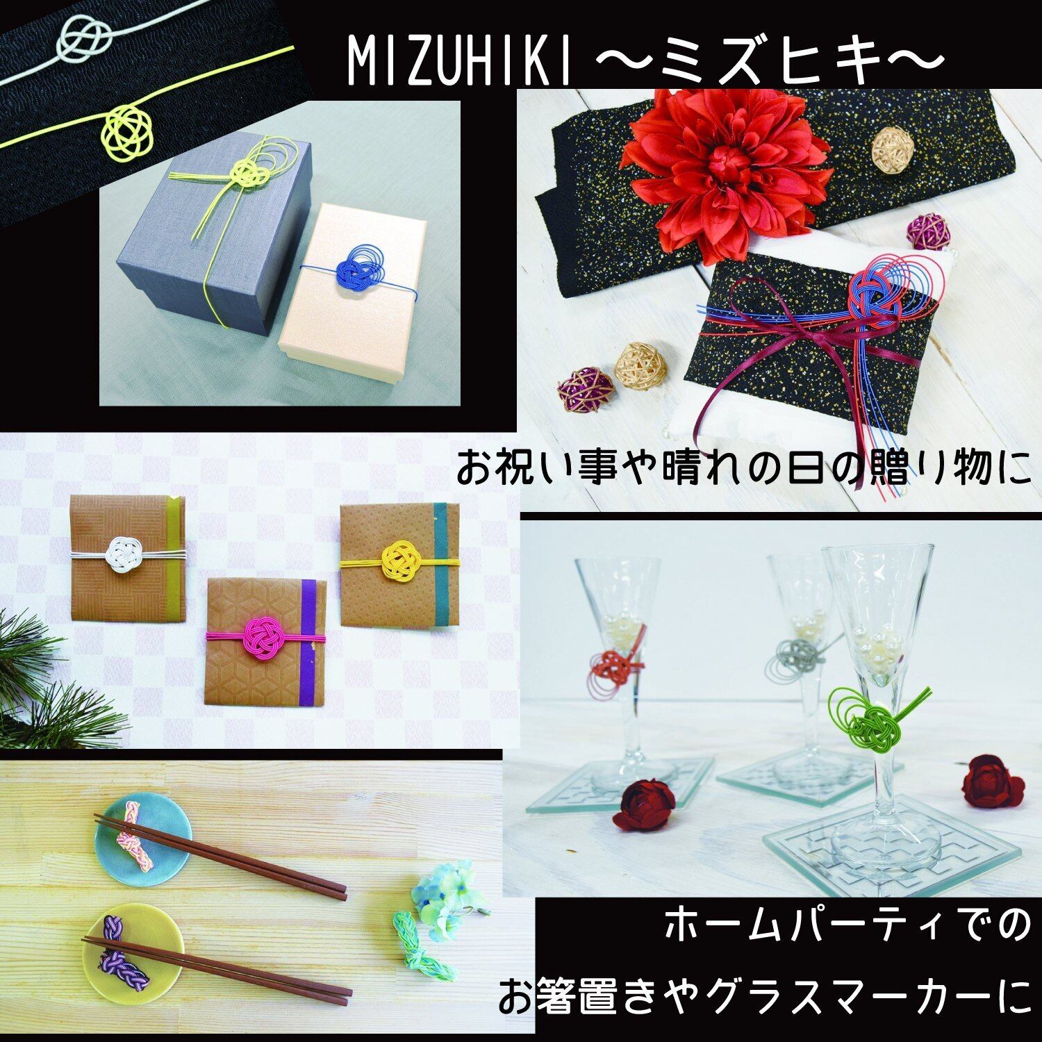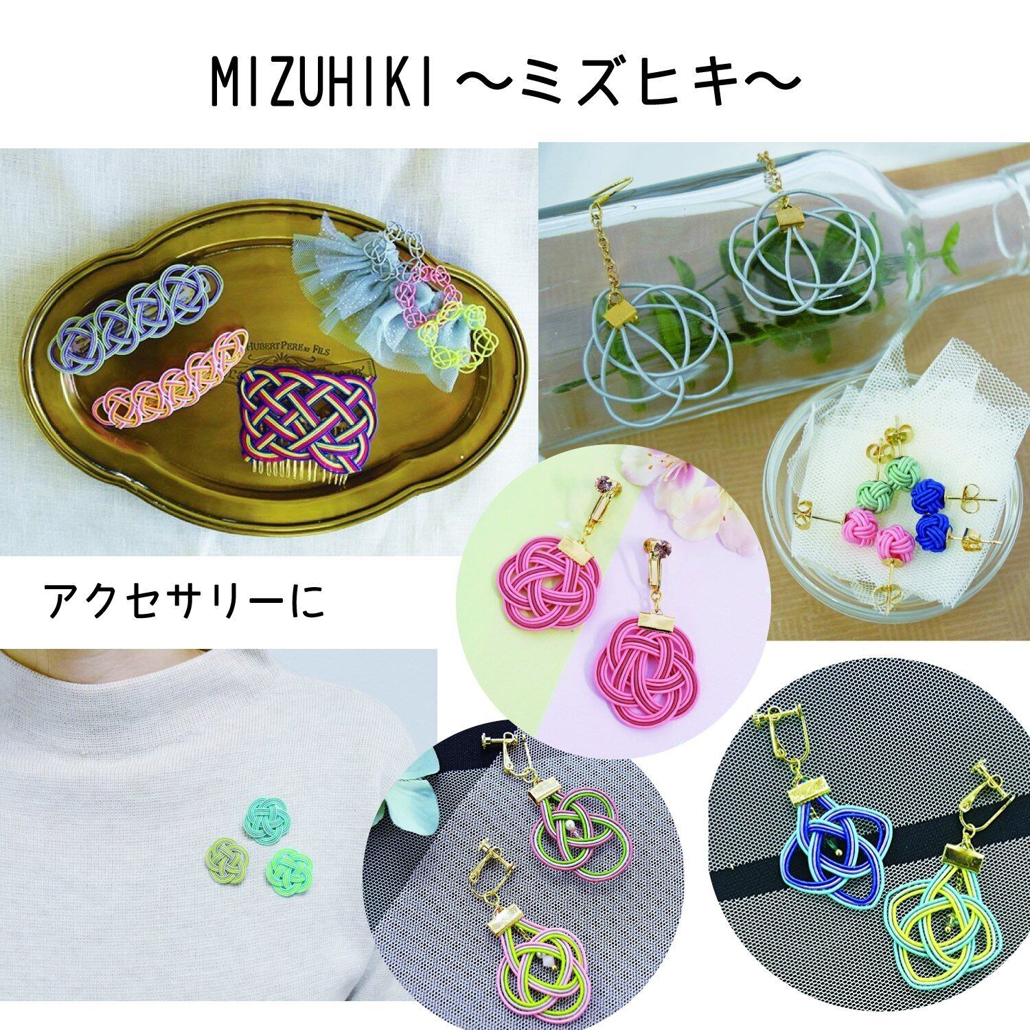 オシャレなカラーの水引で、オリジナルのお祝い袋やアクセサリー、小物など、様々なクラフトをお楽しみ頂けます。