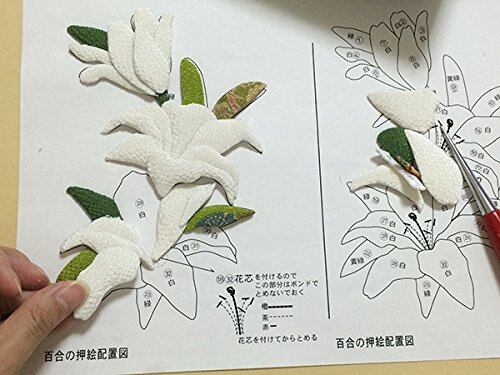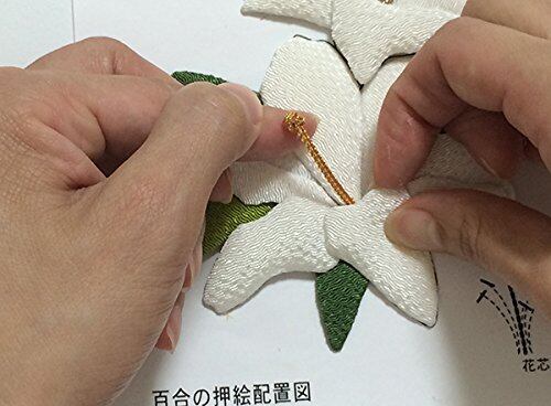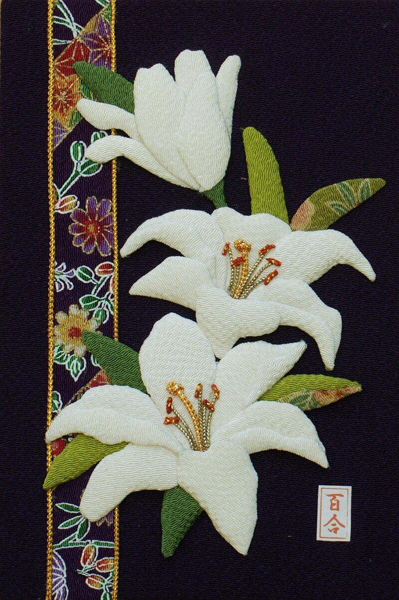 百合をモチーフに、押絵の技法を簡単にアレンジして壁掛け用土台にあしらった和の置き物です。ちりめんの風合いがとっても素敵です