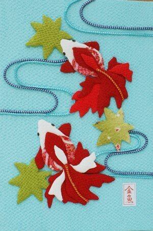 金魚をモチーフに、押絵の技法を簡単にアレンジして壁掛け用土台にあしらった和の置き物。ちりめんの風合いがとっても素敵です