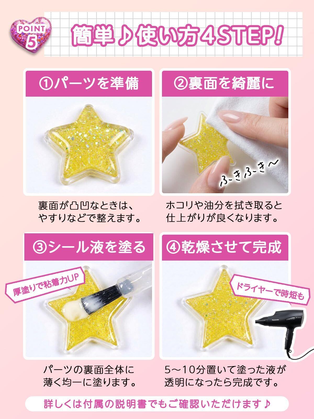 【乾くと透明!作品のデザインを邪魔しない】 乾燥後はクリア仕上げになるため、レジン作品やデコパーツのデザインをそのまま活かせます。ぷっくり可愛いドロップ風シール作りにも最適です。