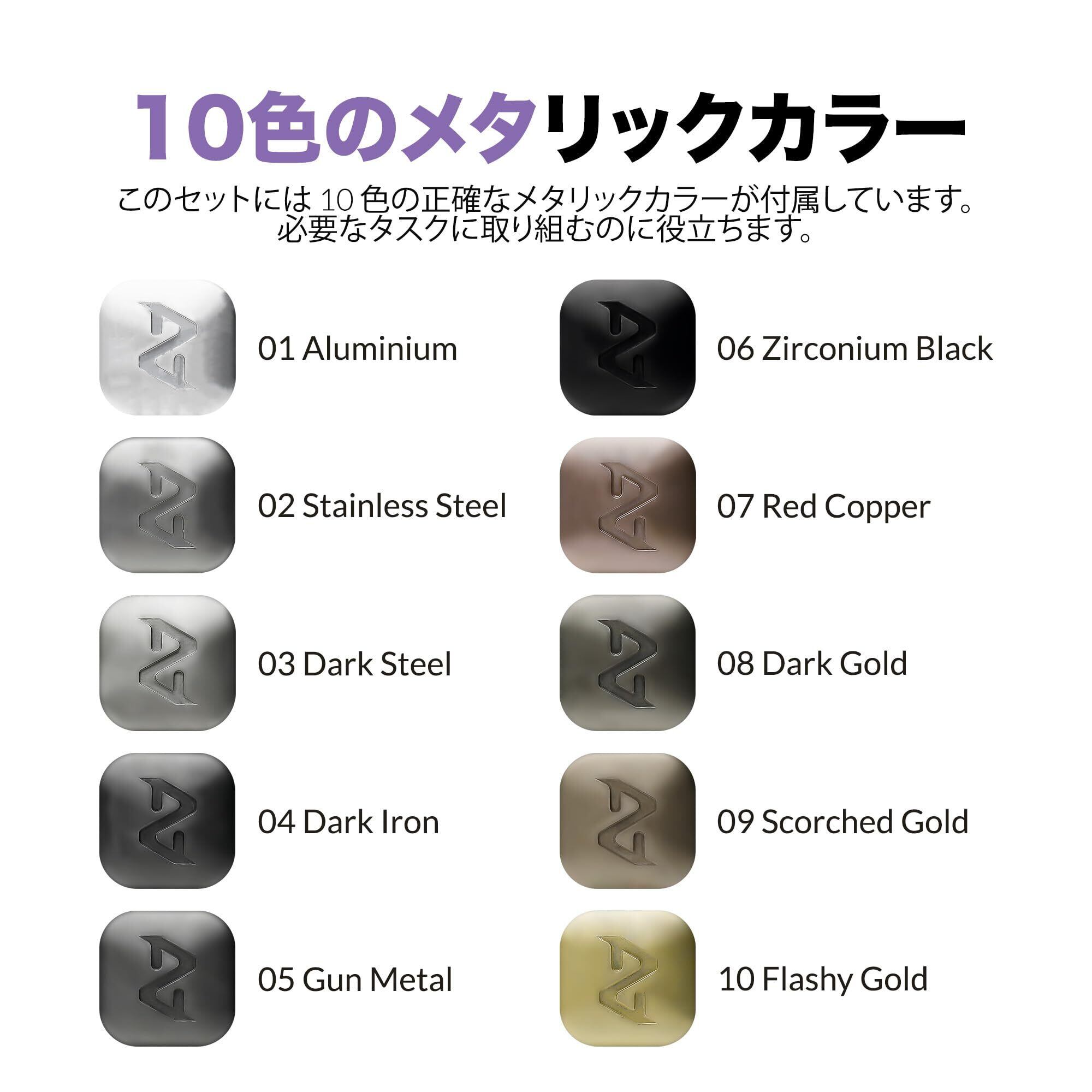10種類のメタリックカラー:このセットには、アルミニウム、不錆鋼、ダークスチール、ダークアイアン、ガンメタル、ジルコニウムブラック、レッドカッパー、ダークゴールド、焦げた金、輝く金を含む10種類の正確なメタリックカラーが含まれており、あらゆるタスクに完璧なパレットを提供します。