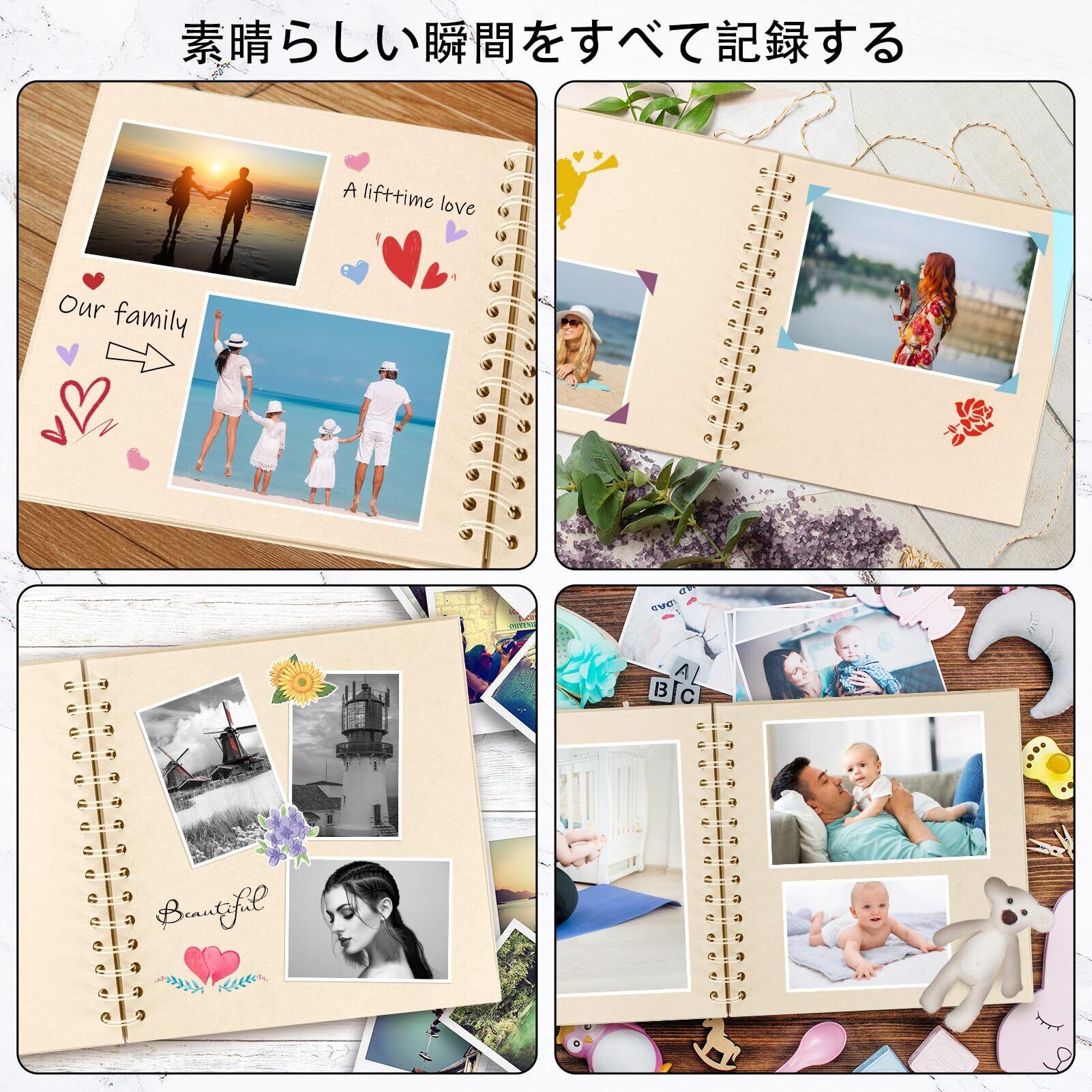【丈夫な材質】カバーはハードボール紙を採用しており、インナーページは厚手のクラフト紙で作られ、手触りがよくて耐久性に優れ、長期保管に最適です。耐久性のある360度の金属コイルのデザインは美しく、レトロでファッショナブルで、アルバムのページが落ちることを心配する必要はありません。