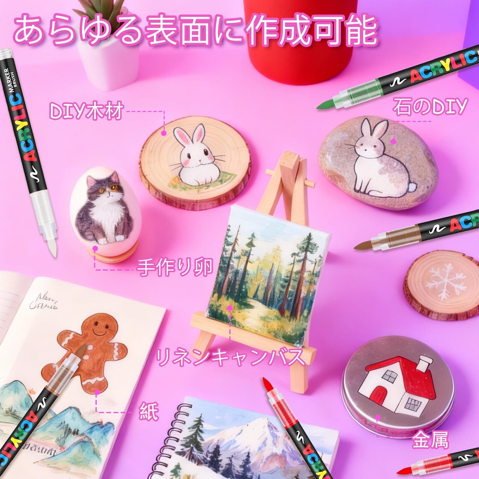 【様々な表面に対応】このカラーアクリルマーカーは、柔軟性が高く柔らかいペン先を備えており、様々な太さの線を描くことができます。当社のペイントマーカーは、細かい作業には30度の傾斜角度、輪郭線や文字の描画には45度の傾斜角度、広い面積に色を塗るには70度の傾斜角度が適しています。アクリルペンは様々な素材にクリエイティブなペイントを施すことができます。当社のアクリルペイントペンセットを使えば、木材、石材、プラスチック、布、紙、ガラス、金属、陶器など、様々な素材に美しいデザインを簡単に描くことができます。