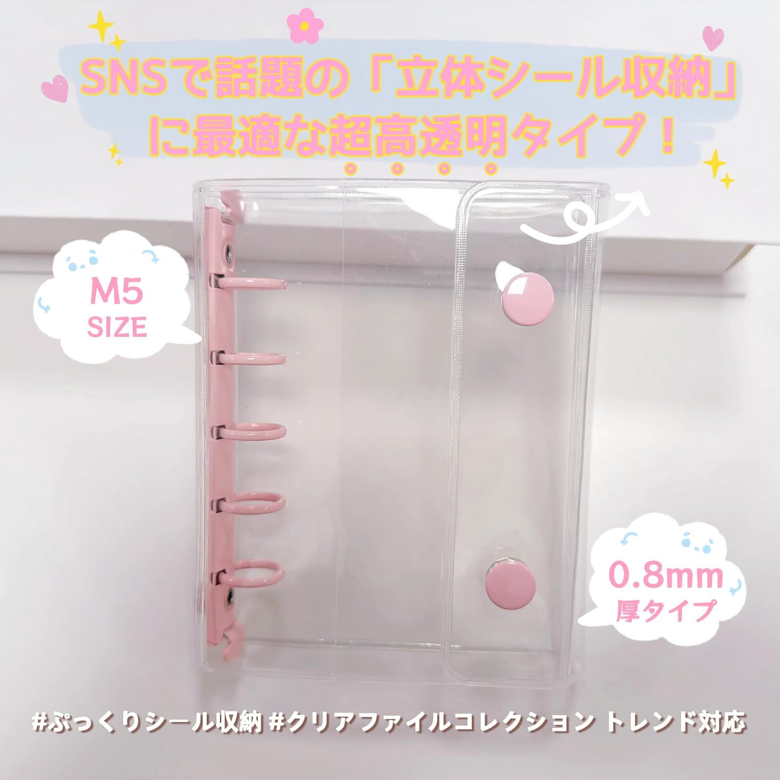 【数量限定】zenoco シール帳 透明バインダー 推し活グッズ m5 マイクロ5 女の子 はがせる 5穴 シール収納 厚め 台紙付き(リフィル20枚セット・ピンク)