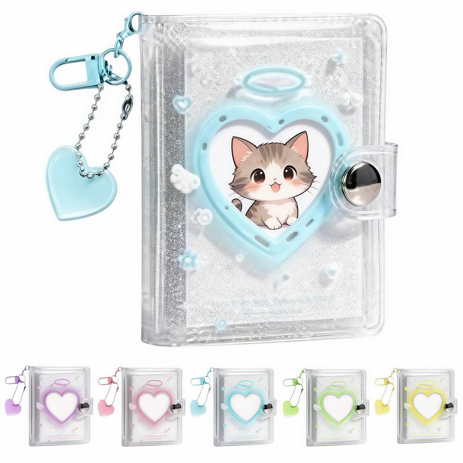 ミニ シール帳 ミニアルバムキーホルダーチャーム付き スモールフォトアルバム 2インチ クリア 推し活 シール収納 3層構造 表裏ポケット プリクラ コレクション キーチェーン 可愛い 女の子 シール帳 子供 バインダー 1冊には20枚収納 小型 DIY 手作り 写真入れ 思い出 結婚式 バレンタインギフト (ライトブルー)