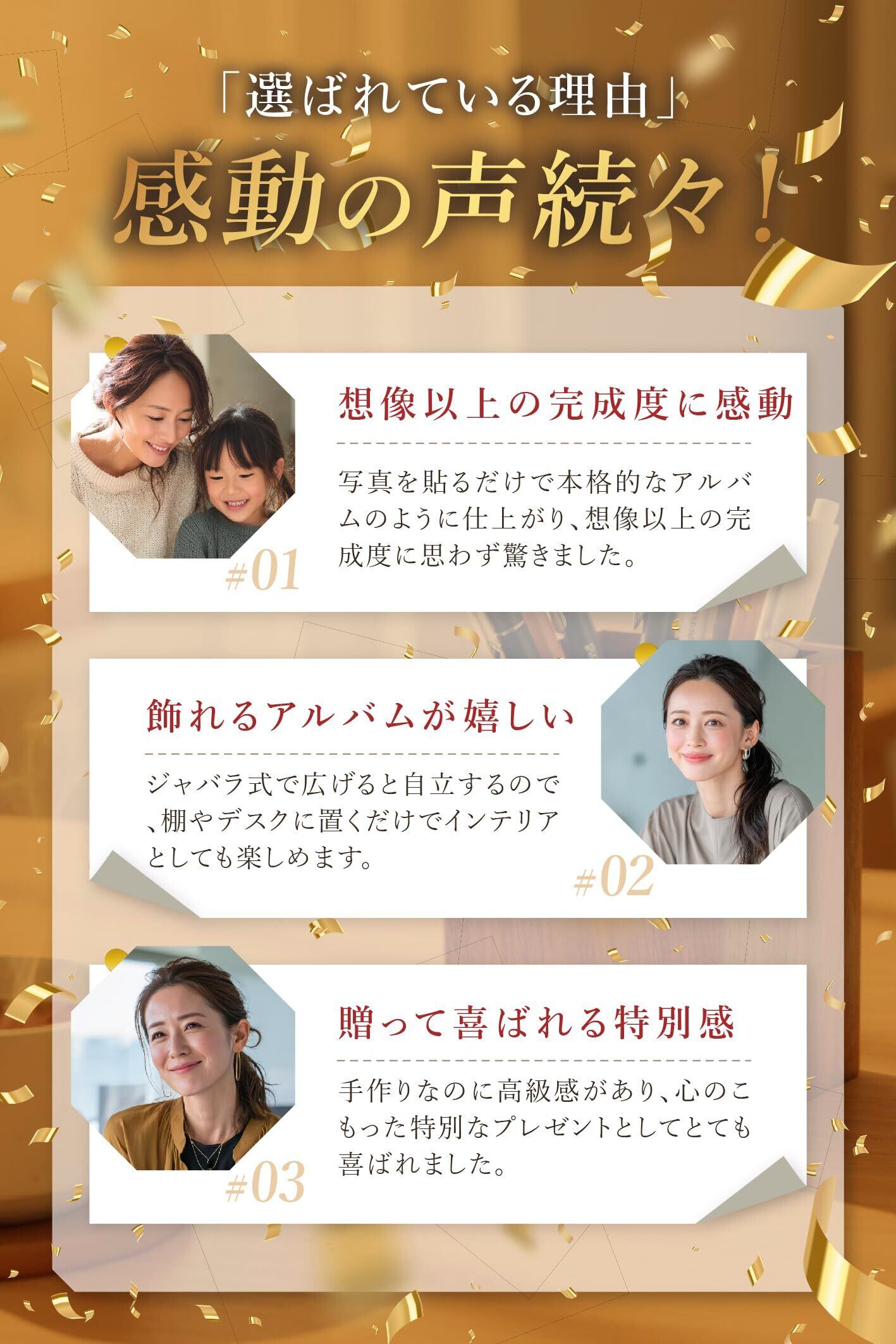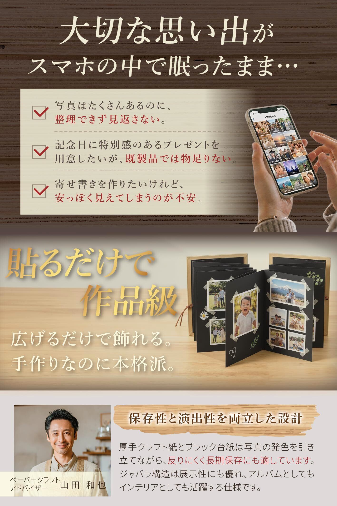 【ジャバラ式34面構造】 アコーディオンのように大きく広がるジャバラ構造を採用。全34面(表16面・裏18面)に写真やメッセージを配置できます。ページをめくる一般的なアルバムとは違い、一気に展開できるためストーリー性のあるレイアウトが可能。時系列に並べたり、テーマ別に配置したりと使い方は自由自在。視覚的なインパクトが強く、ギフトシーンでも印象に残ります。