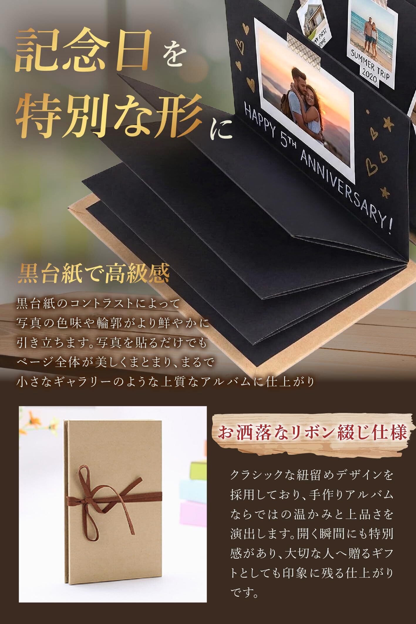 【写真が映えるブラック台紙】 黒台紙は写真のコントラストを際立たせ、人物や風景をより鮮明に演出。カラフルなデコレーションや白ペンでのメッセージも美しく映えます。シンプルだからこそ高級感があり、完成度の高い仕上がりに。